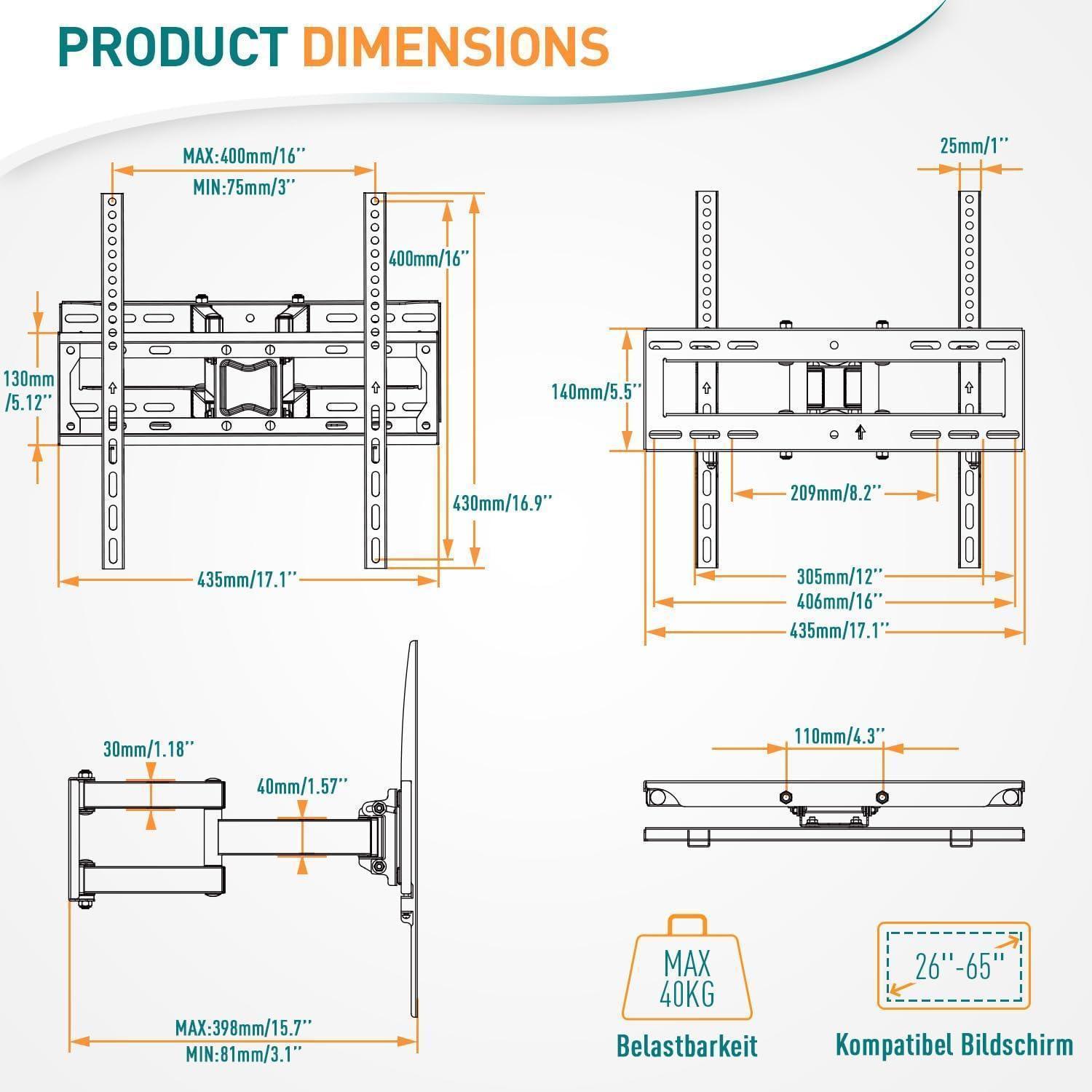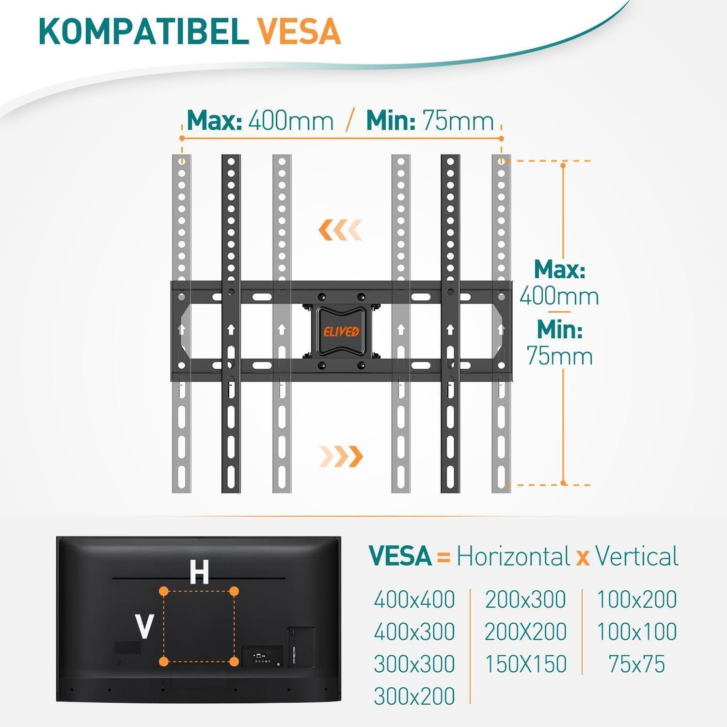 Die ELIVED Schwenkbare TV Wandhalterung ist die ideale Lösung, um Ihren Fernseher stilvoll und sicher zu montieren. Mit einer Tragfähigkeit von bis zu 40kg und einer VESA-Unterstützung von 75x75mm bis 400x400mm passt diese TV Halterung für die meisten 26-65 Zoll Flach- und Curved Fernseher.
