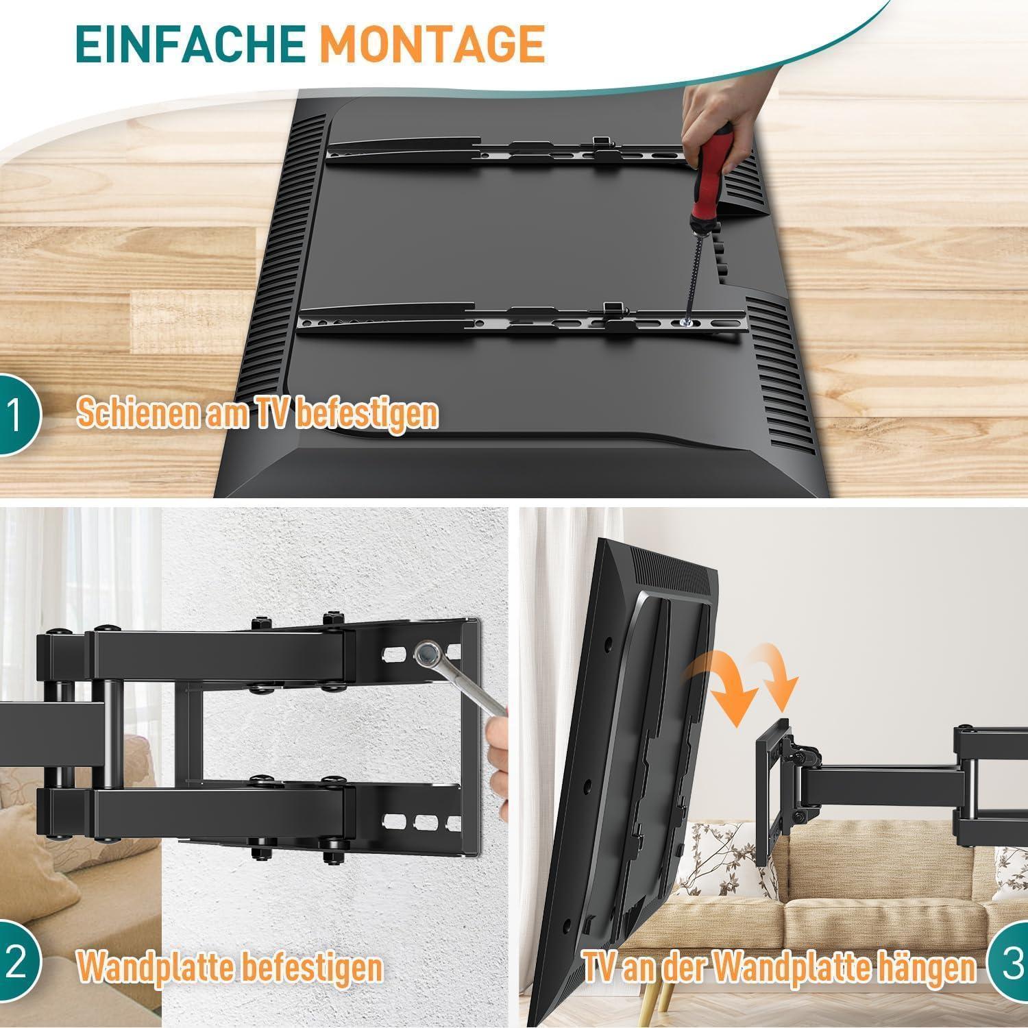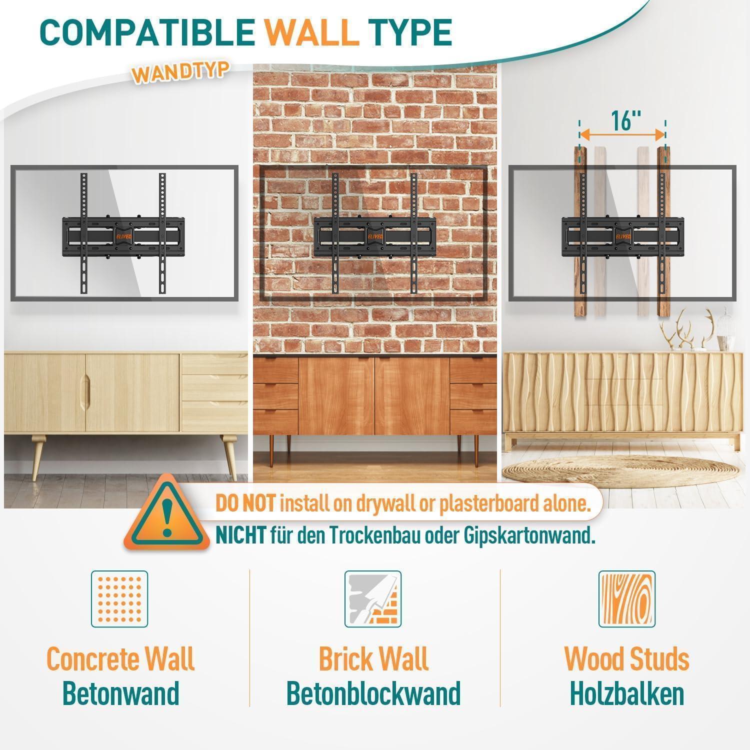 Bitte beachten Sie, dass diese TV Wandhalterung für die Montage an massiven Betonwänden oder Holzpfosten geeignet ist, jedoch nicht für den Trockenbau oder Gipskartonwände. Vor dem Kauf empfehlen wir, die Kompatibilität anhand von Größe, Gewicht und VESA Ihres Fernsehers zu überprüfen, um eine reibungslose Installation zu gewährleisten.