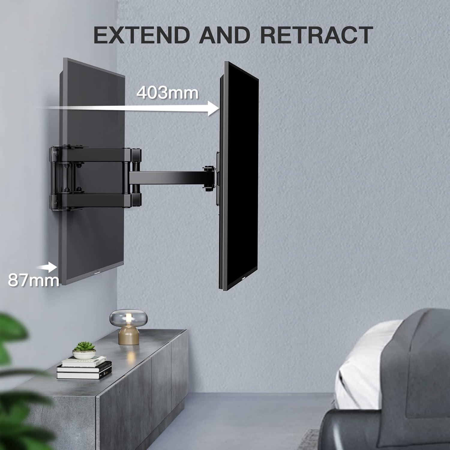 WIE SCHAFFEN SIE MEHR RAUM? Haben Sie wenig Raum? Unsere TV Wandhalterung verwendet Platz an der Wand, um Platz auf dem Schreibtisch zu sparen, sodass Ihr Schreibtisch mehr Platz für wertvollere Dinge hat! Entworfen mit zwei Gelenkarmen, die sich in der eingefahrenen Position 87mm von der Wand zurückziehen, und sich bis zu einem Maximum von 403mm von der Wand ausfahren lassen.