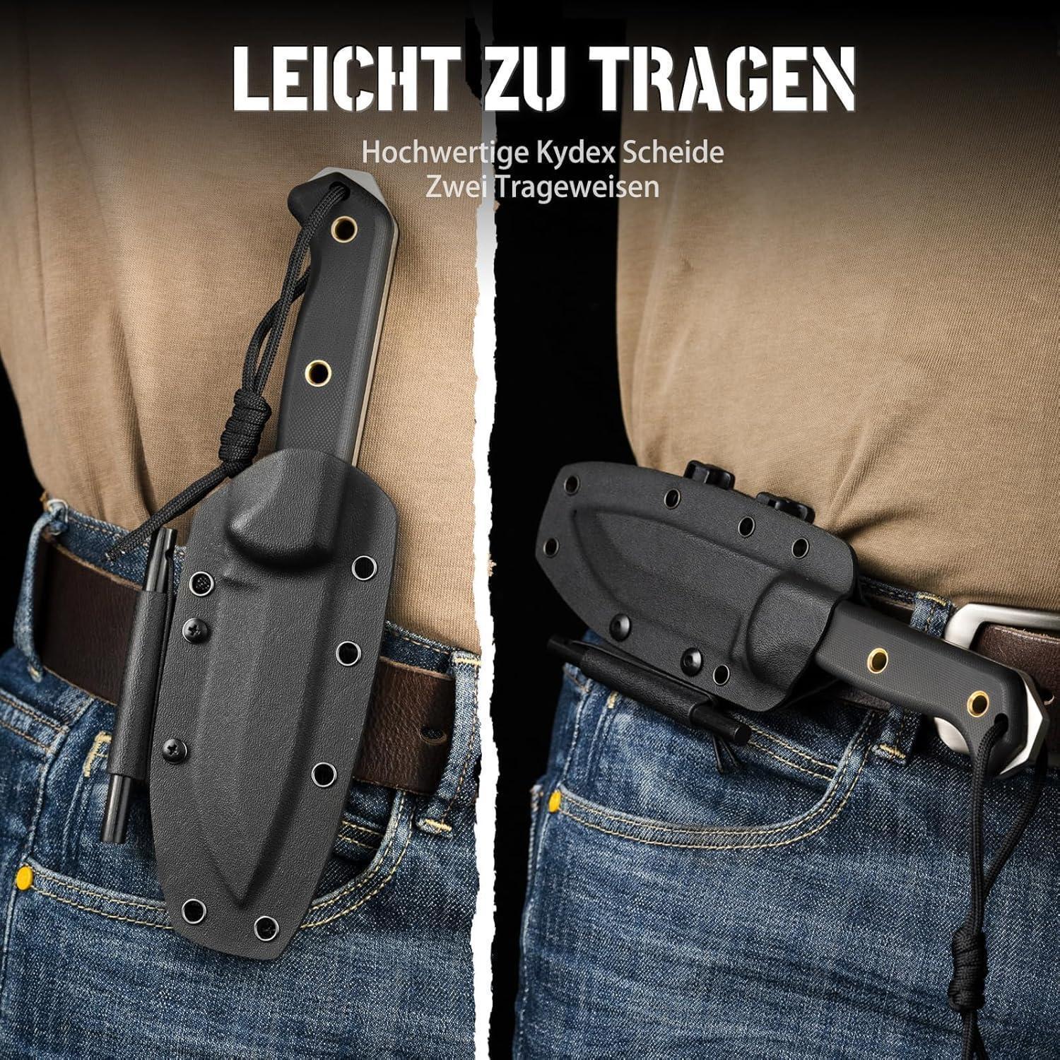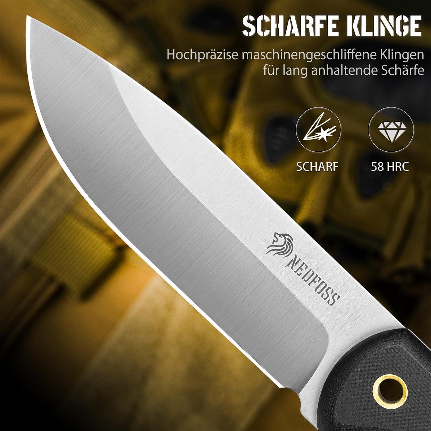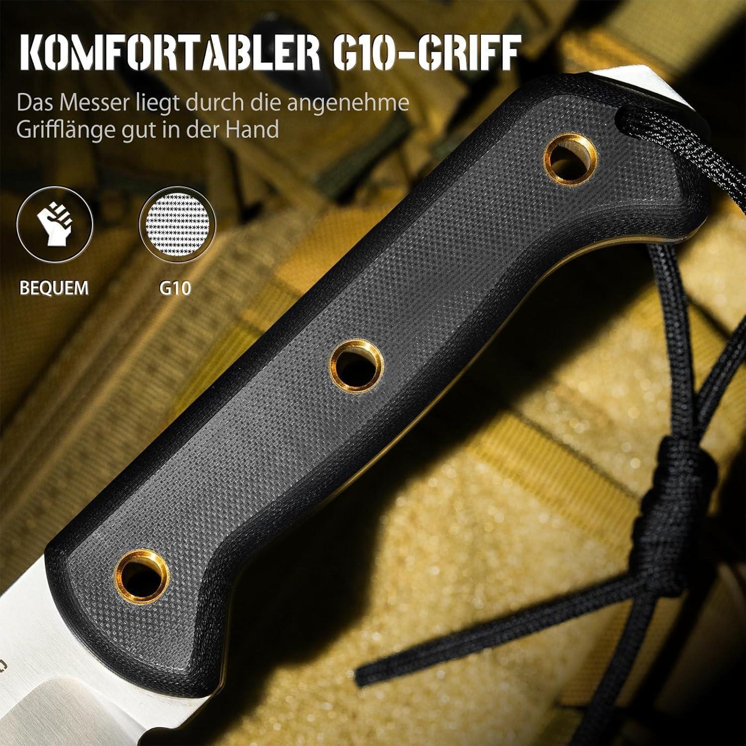 FULL TANG - KONSTRUKTION: Die Klinge aus 8CR13MOV Stahl mit einer Härte von 58 HRC ist von der Spitze bis zum Ende des Griffs aus einem einzigen, 23.5cm langem Stück gefertigt. Extrem stark und haltbar, perfekt für Camping und Outdoor-Aktivitäten.
