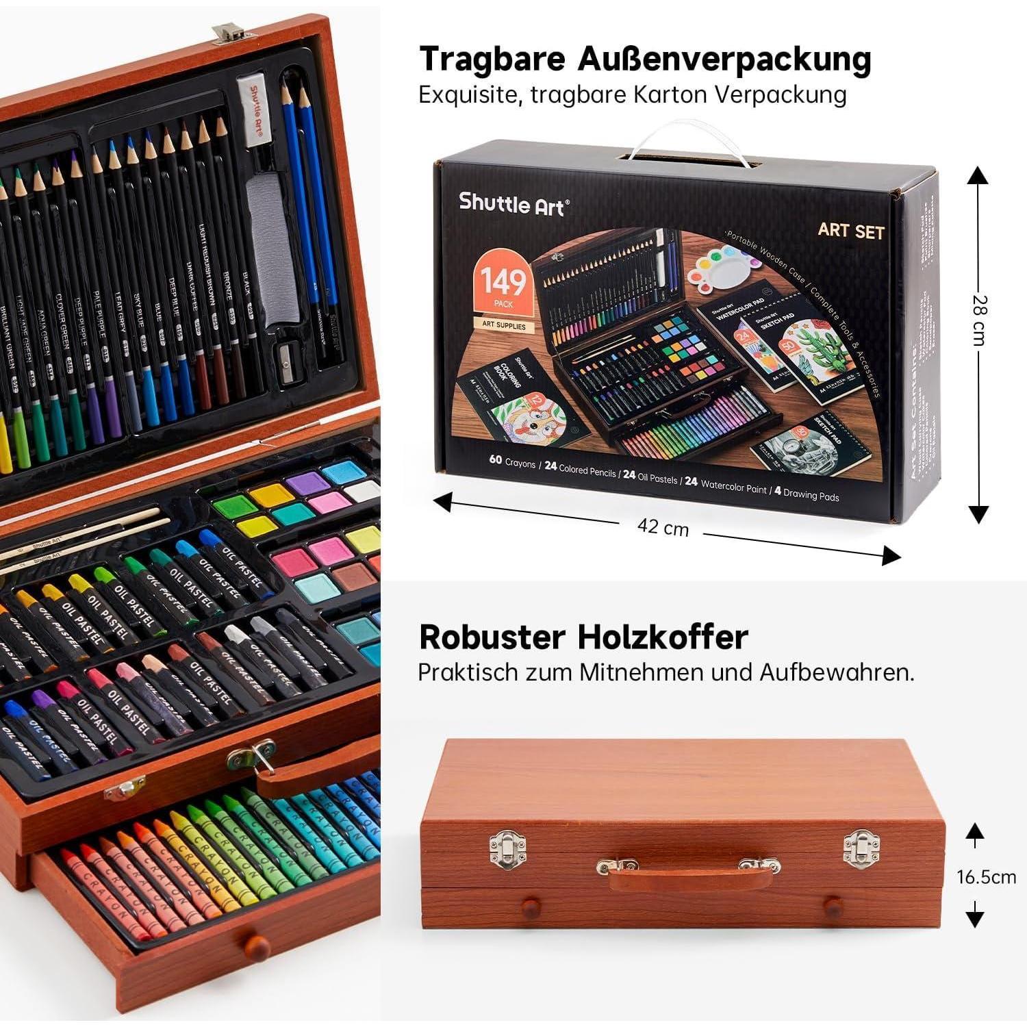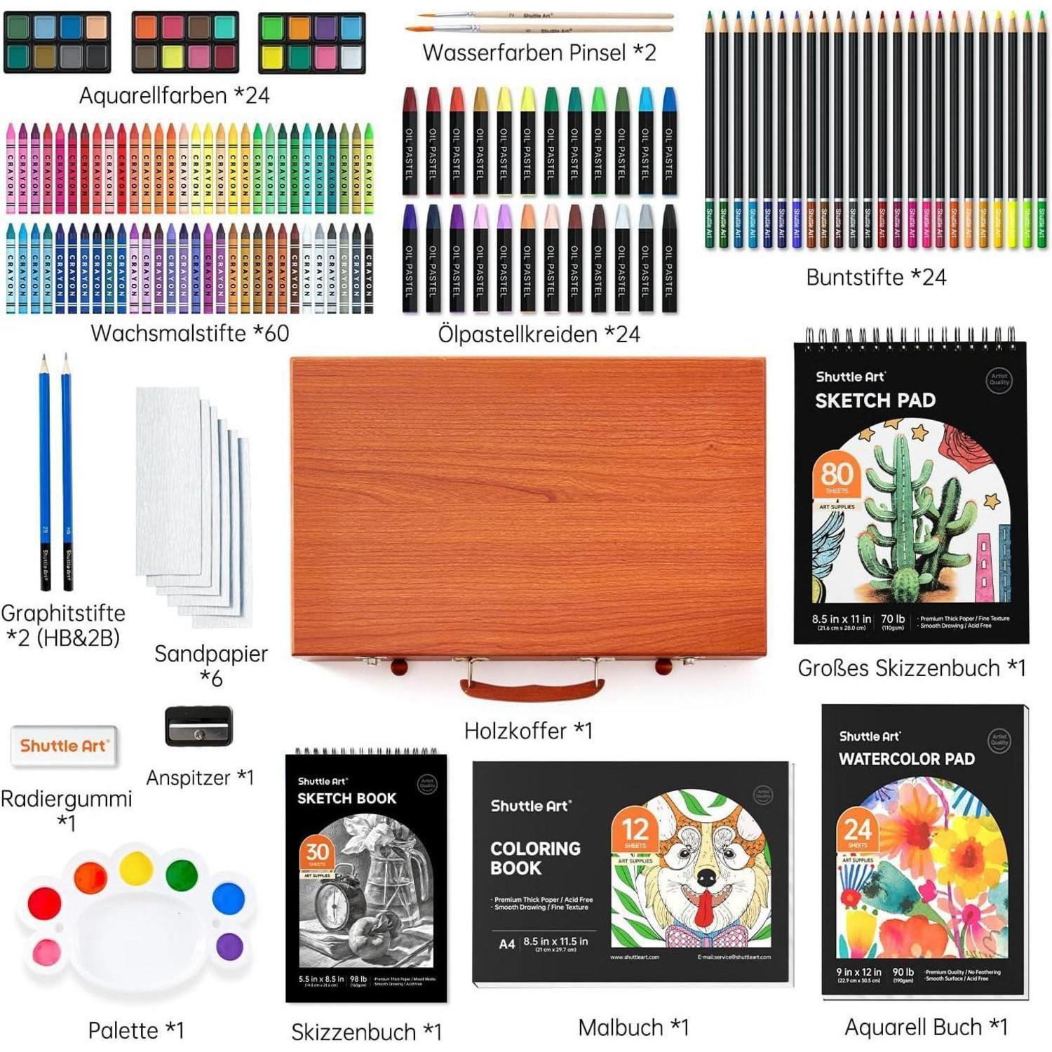 Das Set enthält: 1 Holzkoffer, 60 Wachsmalstifte, 24 Buntstifte, 1 Sandpapier, 1 Radiergummi, 1 Bleistiftspitzer, 1 HB-Bleistift, 1 2B-Bleistift, 10 Pinsel, 24 Ölpastellkreiden, 24 Farben festes Aquarell, 1 Malbuch, 1 Aquarell Buch, 1 Skizzenbuch, 1 Bleistiftspitzer, 1 Lineal, 12 Skizzenstifte, 16 farbige Acrylfarbe mit 3 Pinseln, 1 Palette und 1 Tasche, tolles Geschenk für Kinder, die gerne malen.