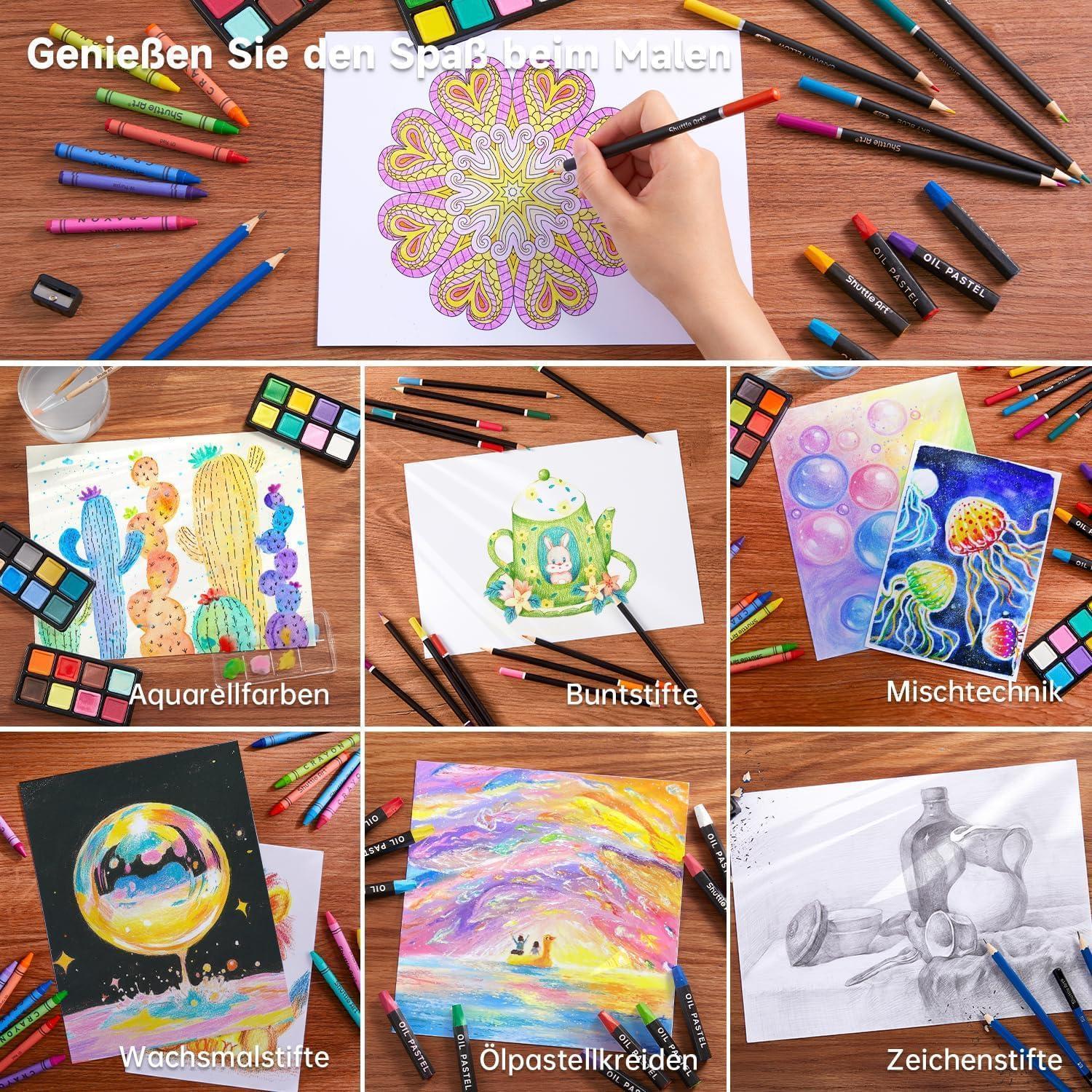 Vielseitiges Set - Enthält Acrylfarben, Buntstifte, Ölpastellkreide, Aquarellfarben und mehr
