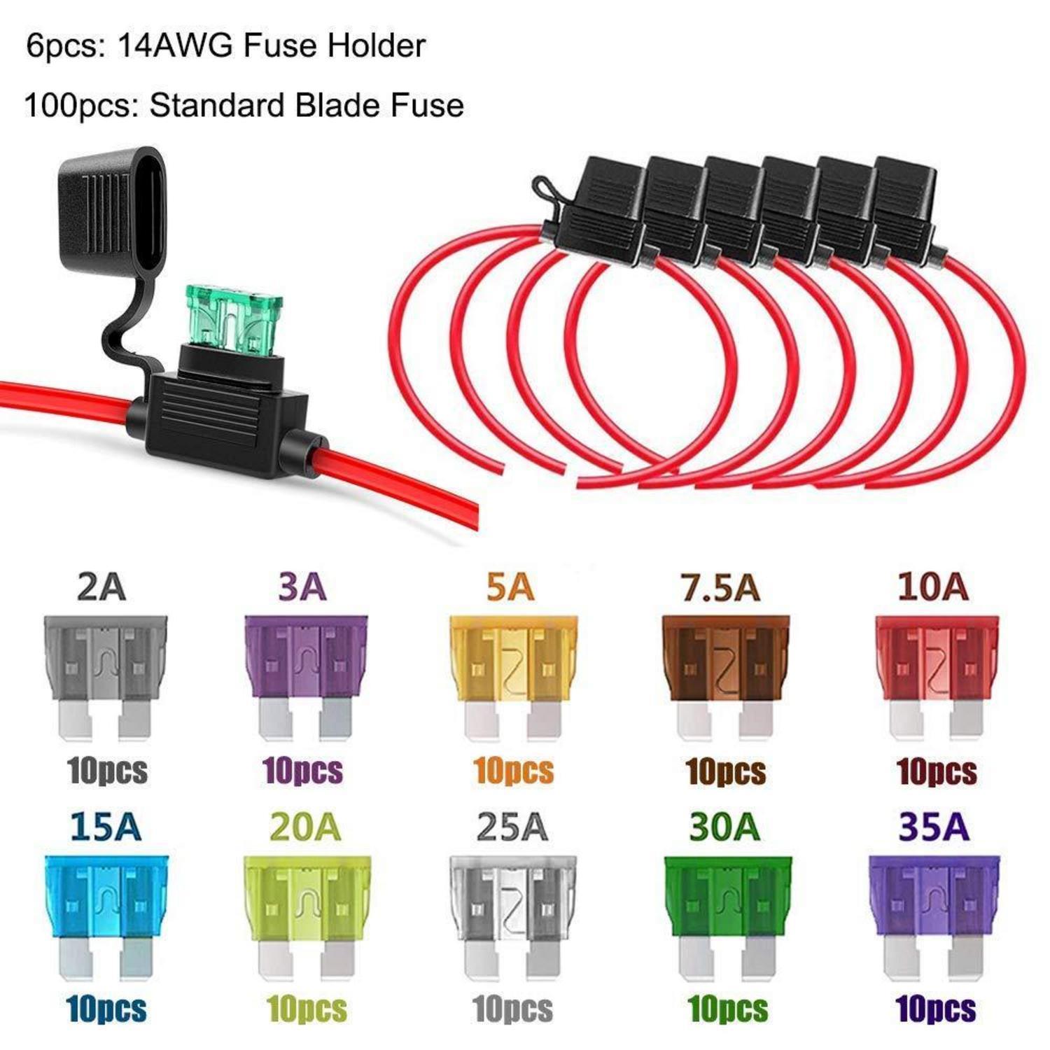 Umfassendes Set: Enthält 6 Sicherungshalter und 100 Standard-Auto-Flachsicherungen in verschiedenen Ampere-Stärken.