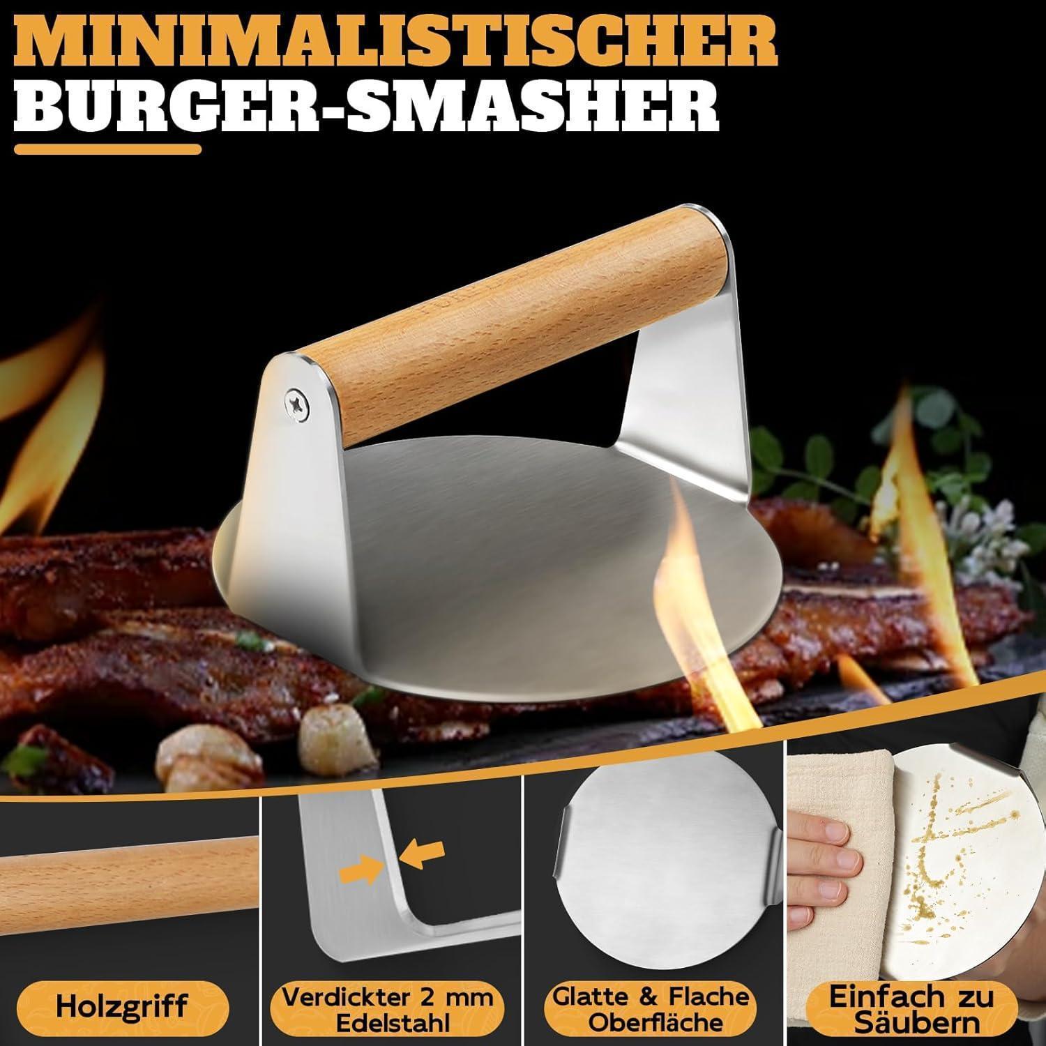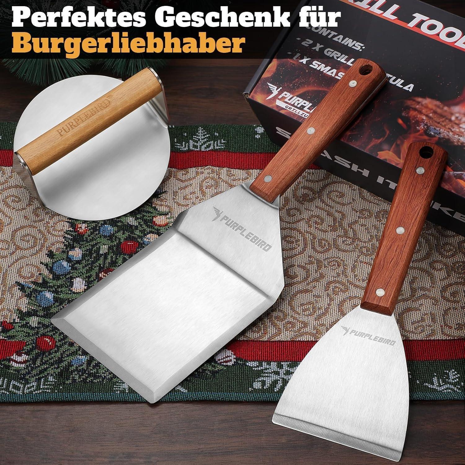 Das PURPLEBIRD Burger-Set besteht aus hochwertigem Edelstahl und beinhaltet eine Burgerpresse, 2 Grillspachtels sowie einen Burger Smasher, perfekt für Smash Burger, Gasgrill, Teppanyaki und BBQ.
