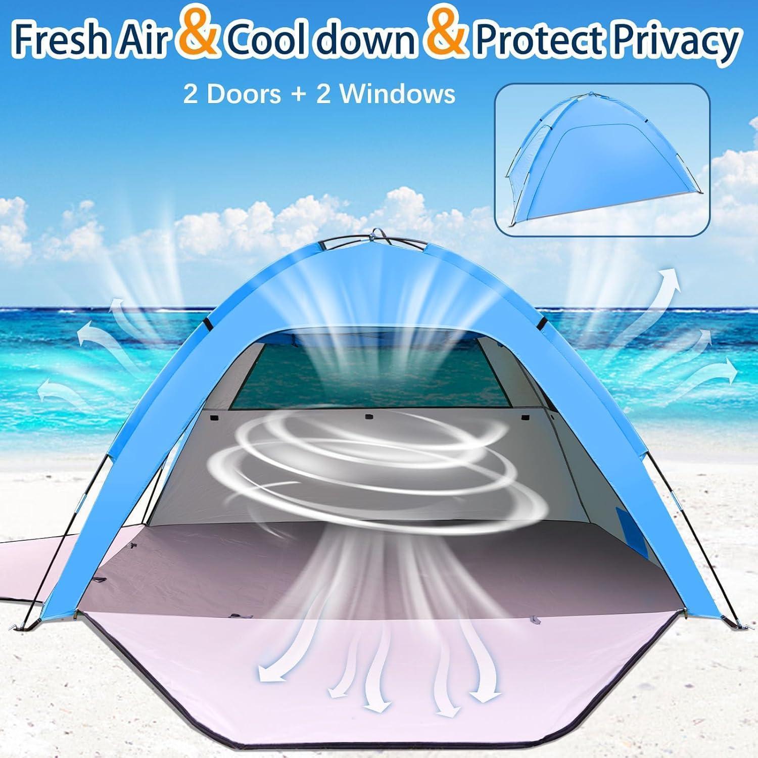 Die Strandmuschel für 1-3 Personen bietet UV-Schutz 80+ dank des hochwertigen 190T silberbeschichteten Stoffes. Dieser schützt nicht nur Ihre Haut vor schädlichen Sonnenstrahlen, sondern sorgt auch für Wärmeisolierung und Atmungsaktivität, damit Sie sich stets wohl fühlen.