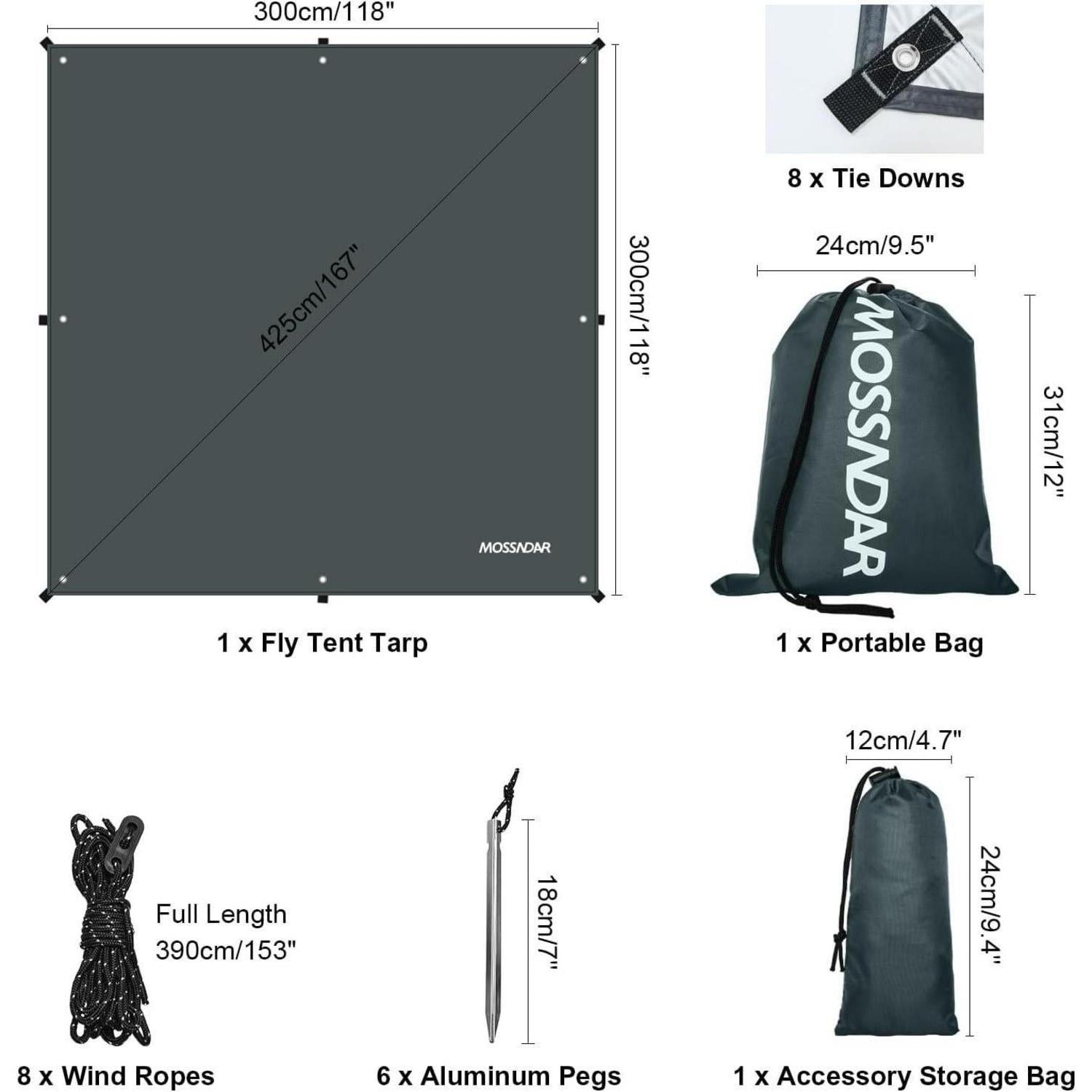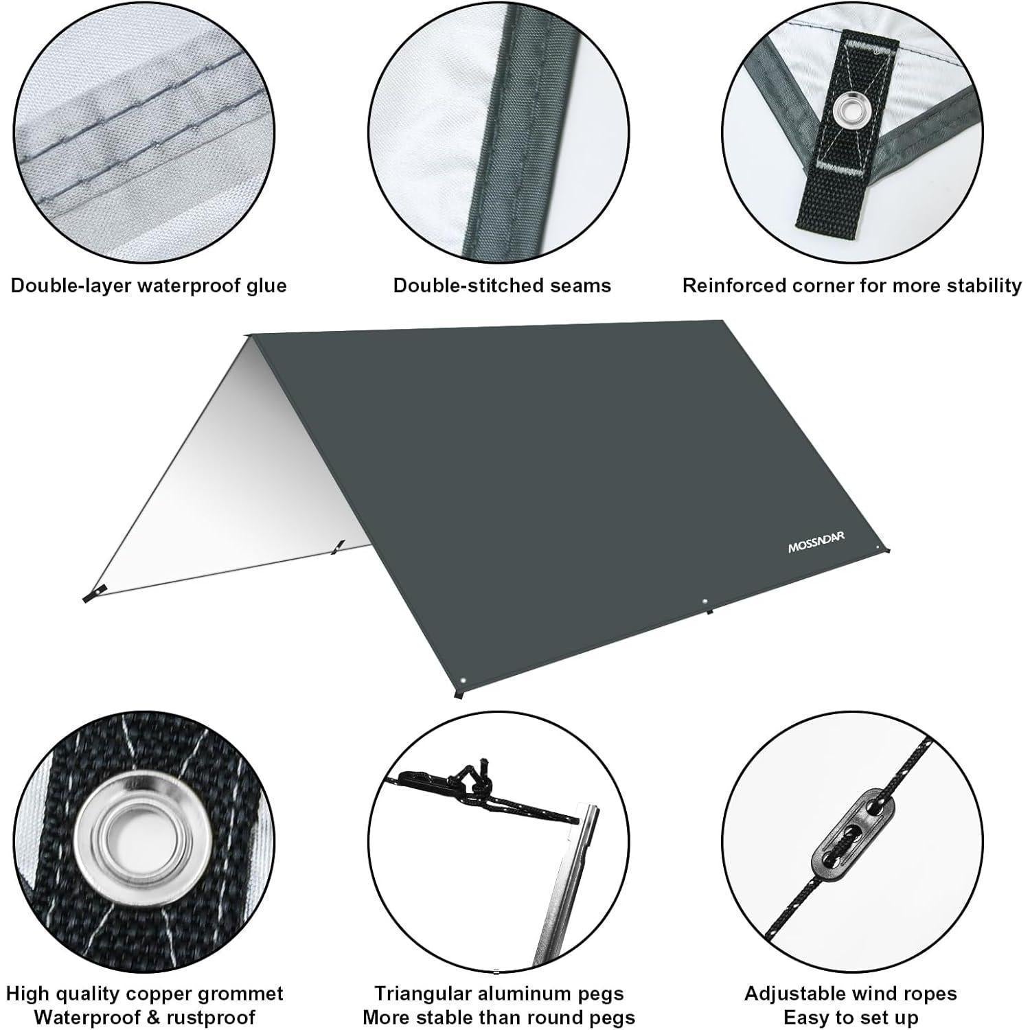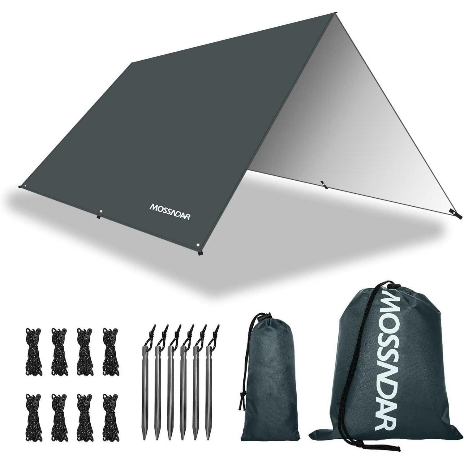 HOCHLEISTUNG ZELTPLANE - Das MOSSNDAR Tarp 3x3 bietet mit 8 Ösen, 8 Seilen, 6 Aluminiumheringen und 2 Tragetaschen alles, was Sie für einen vielseitigen Sonnenschutz benötigen. Die Tarp Zeltplane punktet mit hoher Wasserbeständigkeit, UV-Schutz 50+, Stabilität und Reißfestigkeit. Ein absolutes Must-Have für Camping und Outdoor-Aktivitäten.