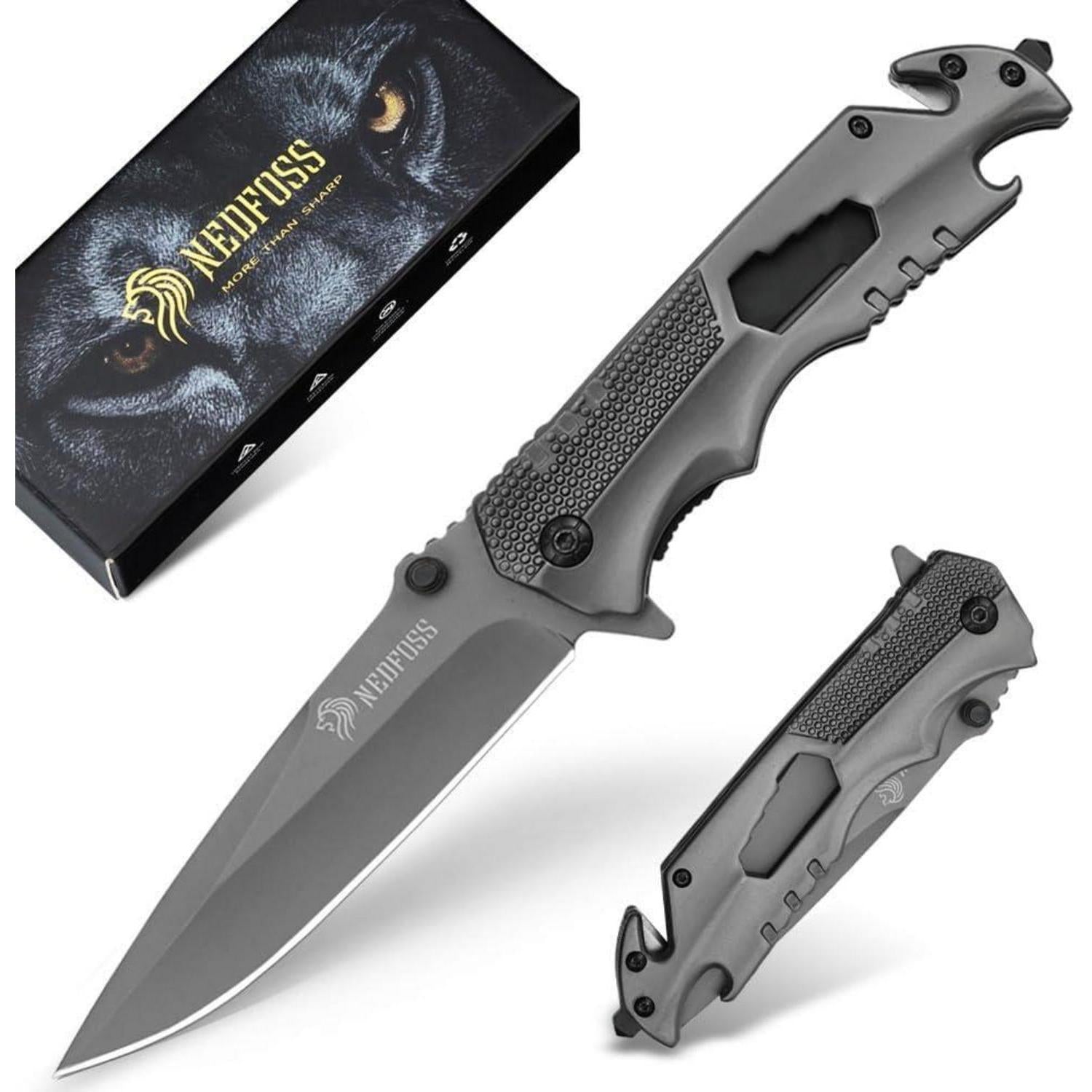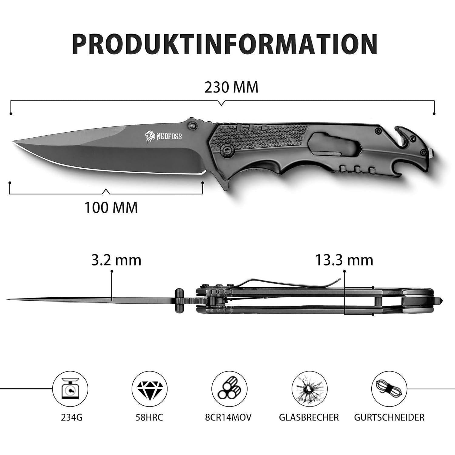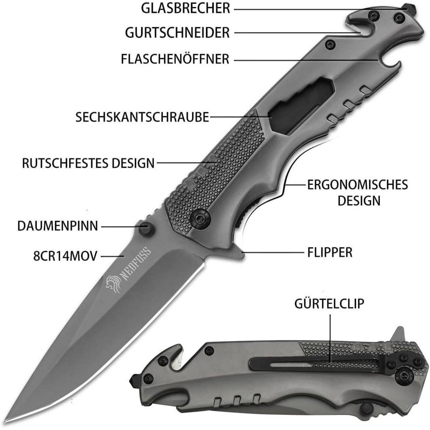 SCHARFE KLINGE: NedFoss FA48 Einhandmesser aus hochwertigem 8Cr14Mov Stahl, besonders scharf und gehärtet auf 58 HRC. Das Klappmesser verfügt zudem über einen Flaschenöffner, Inbusschlüssel, Glasbrecher und Gürtelschneider, und ist daher ein unverzichtbarer Helfer im Alltag.