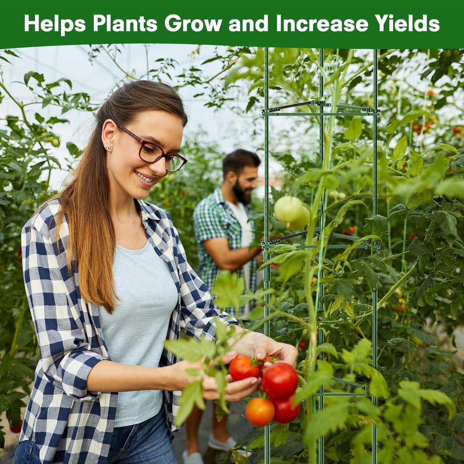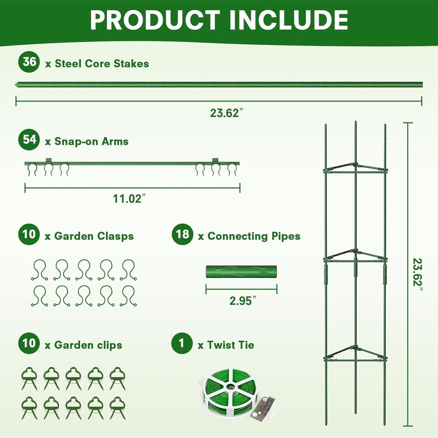 Unser Tomate Rankhilfe im Set wird mit komplettem Pflanzzubehör geliefert, darunter 36 Stahlkernpfähle, 54 Anschraubarme, 10 Gartenspangen, 18 Verbindungsrohre, 10 Gartenklammern und 1 gedrehter Riemen. Dieses Pflanzengerüst ist 49 Zoll hoch, was den Anforderungen der meisten Tomatenpflanzensorten gerecht wird.
