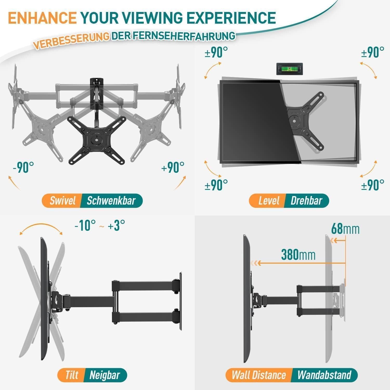 Dank der Neigungsfunktion von +3/-10° können Sie den Betrachtungswinkel anpassen, um Blendeffekte zu minimieren. Die Schwenkfunktion von +/-90° ermöglicht es Ihnen, den Fernseher flexibel zu positionieren, während die Drehung von +/-90° einfache Anpassungen ermöglicht.