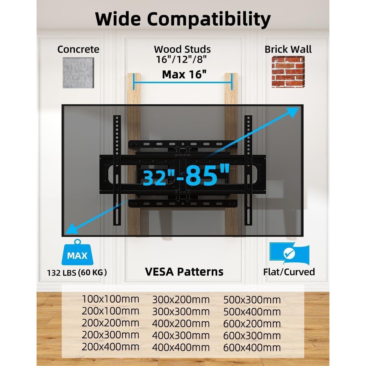 Breite Kompatibilität - Passt für 32-75 Zoll TVs mit einem VESA-Muster von 100x100mm bis 600x400mm und unterstützt ein Gewicht von bis zu 60kg.