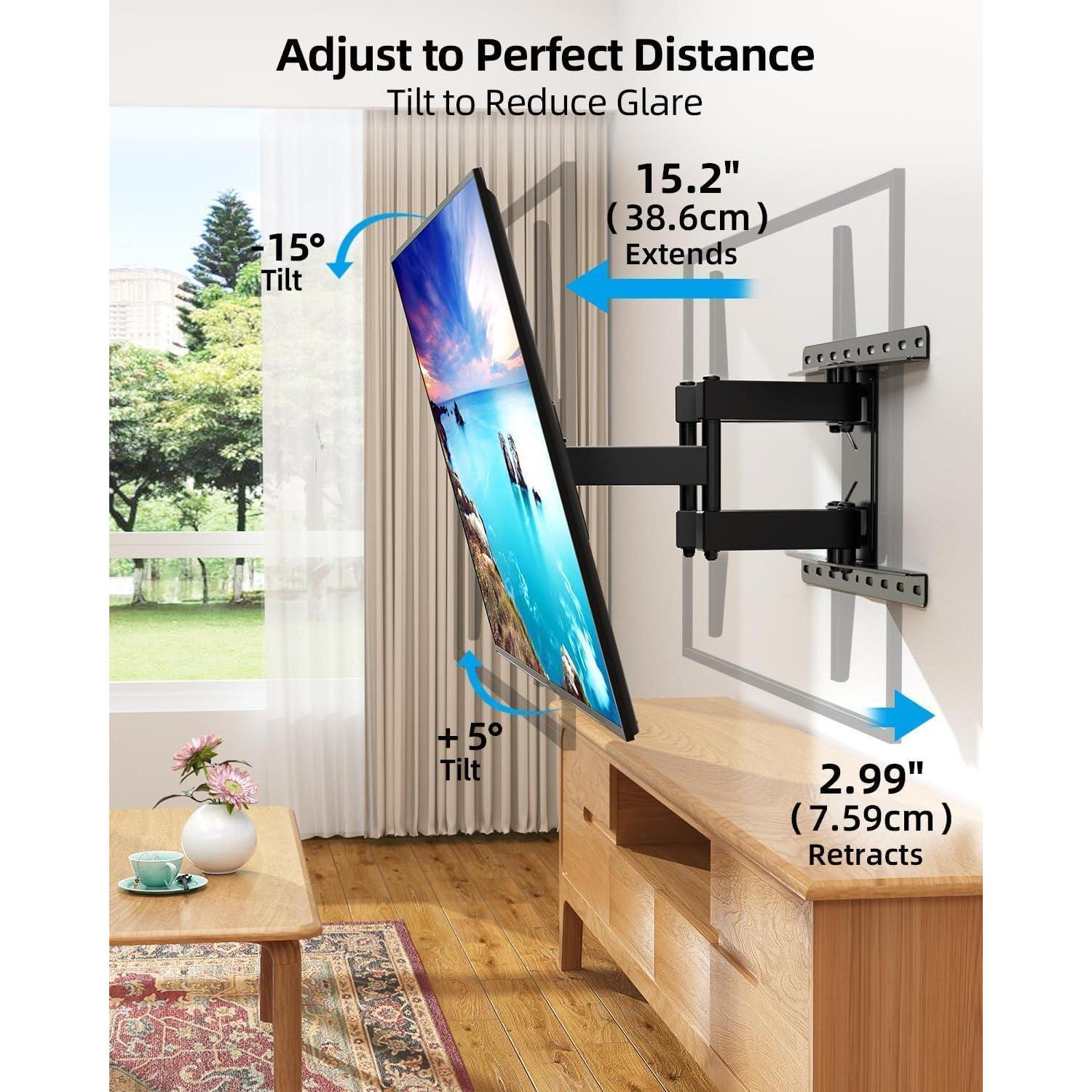 Mit dynamischem Viewing können Sie Ihren Fernseher nach der Installation um ±60° schwenken, +5°/-15° neigen und 15,2" ausfahren oder auf 2,99" von der Wand zurückziehen. Diese vollbewegliche Halterung ist ideal, um Blendungen zu vermeiden oder von verschiedenen Stellen im Raum fernzusehen.