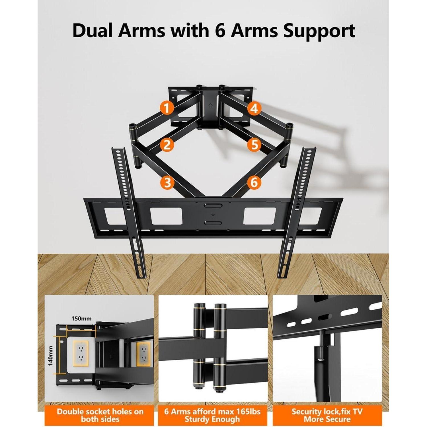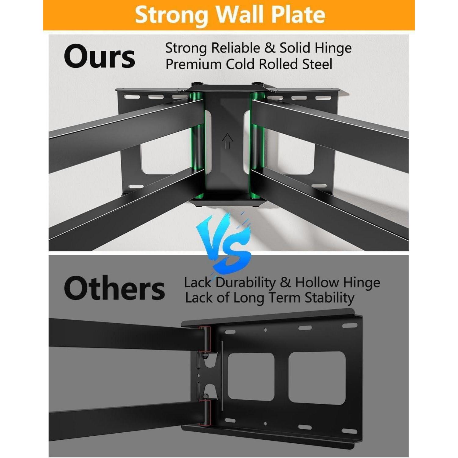Die robuste und sichere Konstruktion der schwenkbaren Fernseher Halterung gewährleistet Langlebigkeit und Zuverlässigkeit. Hergestellt aus schwerem Karbonstahl und gut verschweißten doppelten Gelenkarmen, minimiert diese TV Wandhalterung das Risiko von Unfällen und bietet Ihnen und Ihrer Familie Sicherheit und Frieden des Geistes.