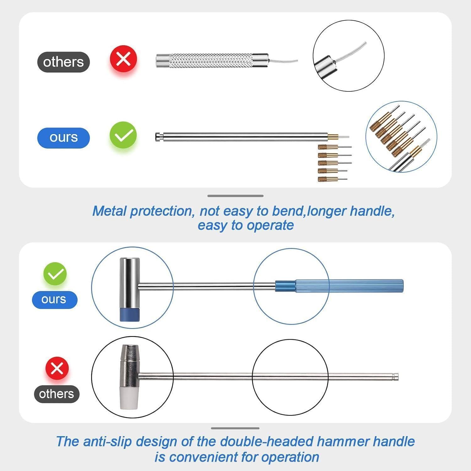 Unterschiede zu anderen Produkten: Im Vergleich zu anderen Produkten haben wir einen Lederband-Locher hinzugefügt, mit dem Löcher gestanzt werden können, um die Länge Ihres Lederarmbands anzupassen. Wir haben die Länge des Nadelstempels verlängert und den Doppelstempel erhöht. Der Kopfhammergriff ist ergonomisch für eine bequeme Bedienung, die Nadel der Nadelstichnadel ist verkürzt und mit einem Metallschutz versehen, um ein Biegen zu verhindern und ausgetauscht zu werden.