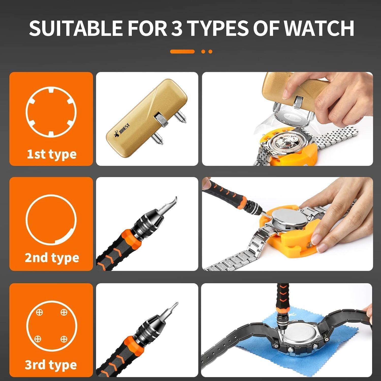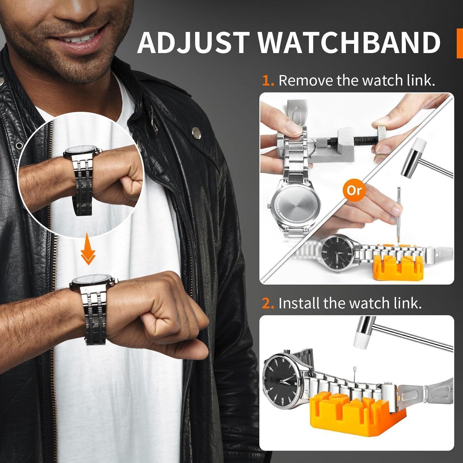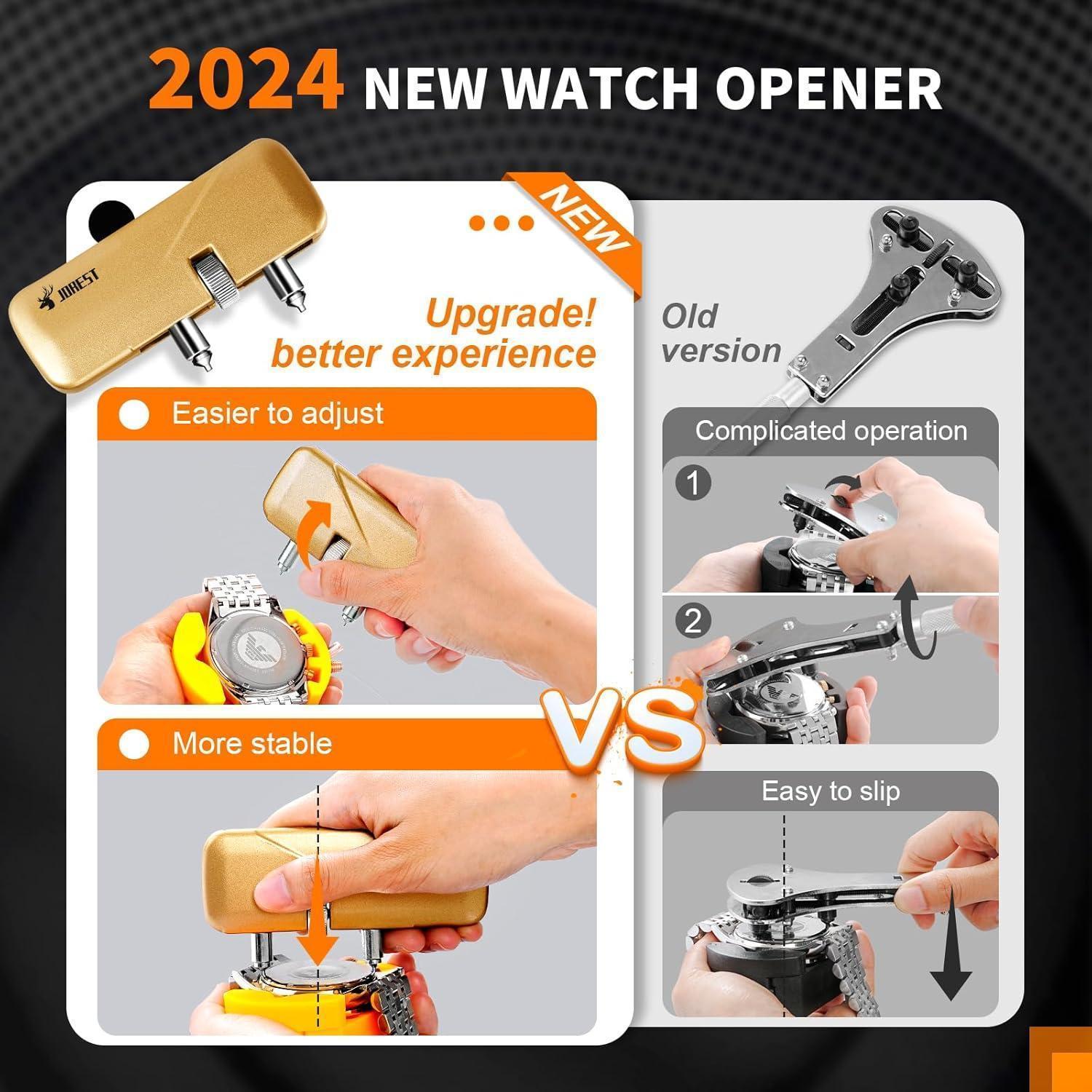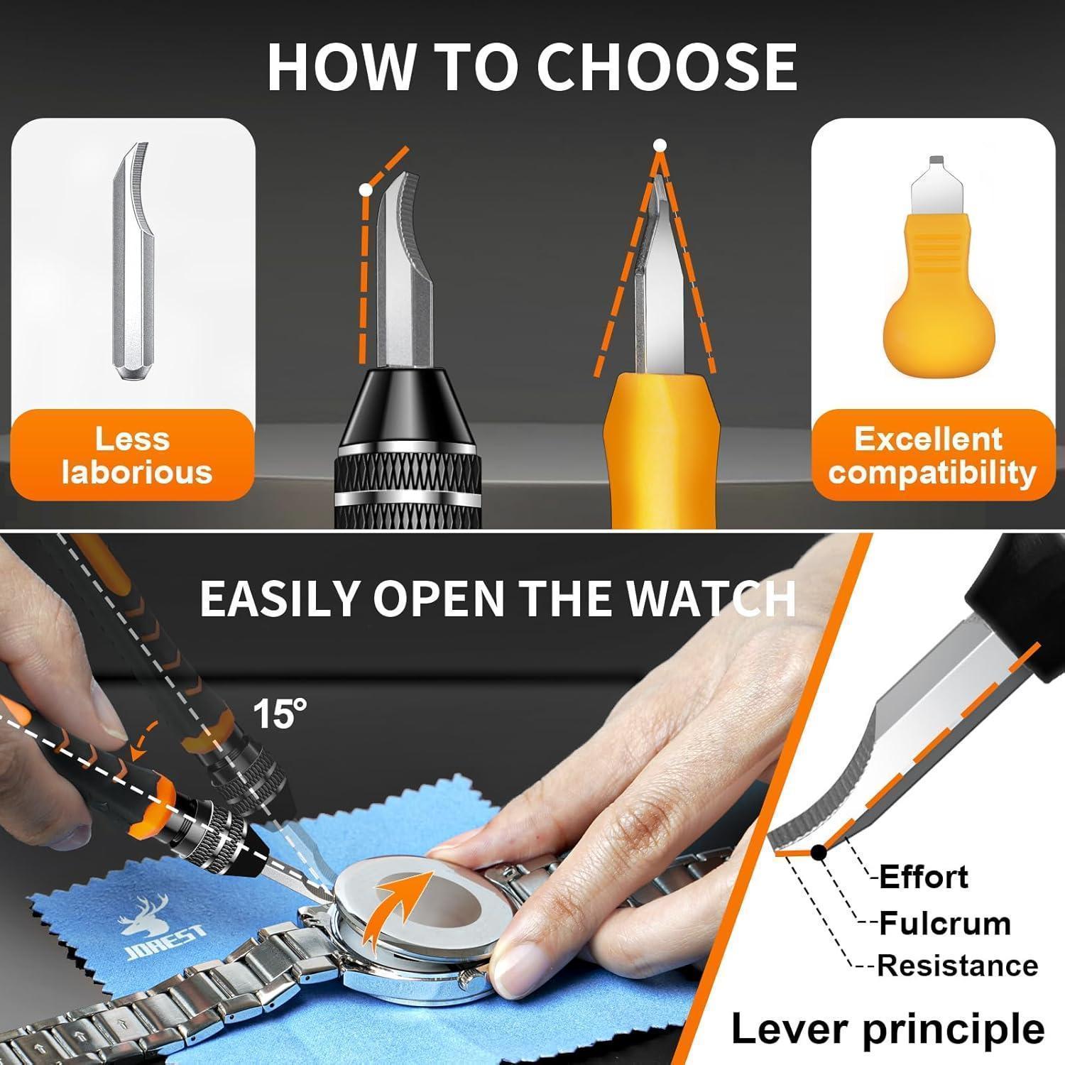 Uhrenwerkzeuge Set, Uhr Batteriewechsel, Uhrenarmband Kürzen Werkzeug, Uhren Reparatur, Uhrmacherwerkzeug mit Stiftausdruck, Uhrenoffner öffner, Schraubendreh, Federstegwerkzeug - Das JOREST Uhrenwerkzeuge Set ist die ultimative Lösung für alle Uhrenreparaturen und -anpassungen. Der 2024 aufgerüstete verstellbare Uhrenöffner bietet eine größere Größe für einen besseren Halt und wird mit drei verschiedenen Backen geliefert, die sich an verschiedene Rillen anpassen können, um Ihnen zusätzliche Stabilität und Sicherheit bei der Arbeit zu bieten.