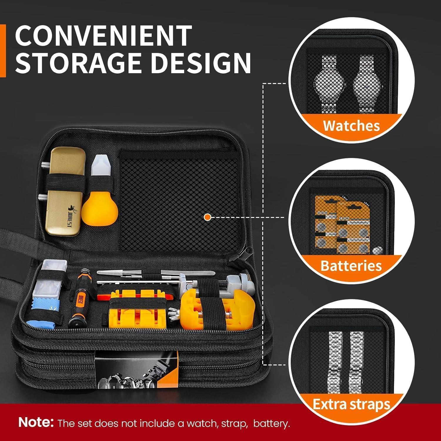 Dank der eingebauten Netztasche können Sie Ihre Werkzeuge und Zubehörteile ordentlich aufbewahren und haben sie jederzeit griffbereit. Das Set ermöglicht das Auswechseln von Uhrenbatterien und das Einstellen von Uhrenarmbändern an Uhrenböden mit Aufbrechöffnungen, Rillen oder Schrauben. Mit dem Metallgliederentferner und dem Hammerwerkzeug können Sie die Armbandlänge problemlos an Ihr Handgelenk anpassen.