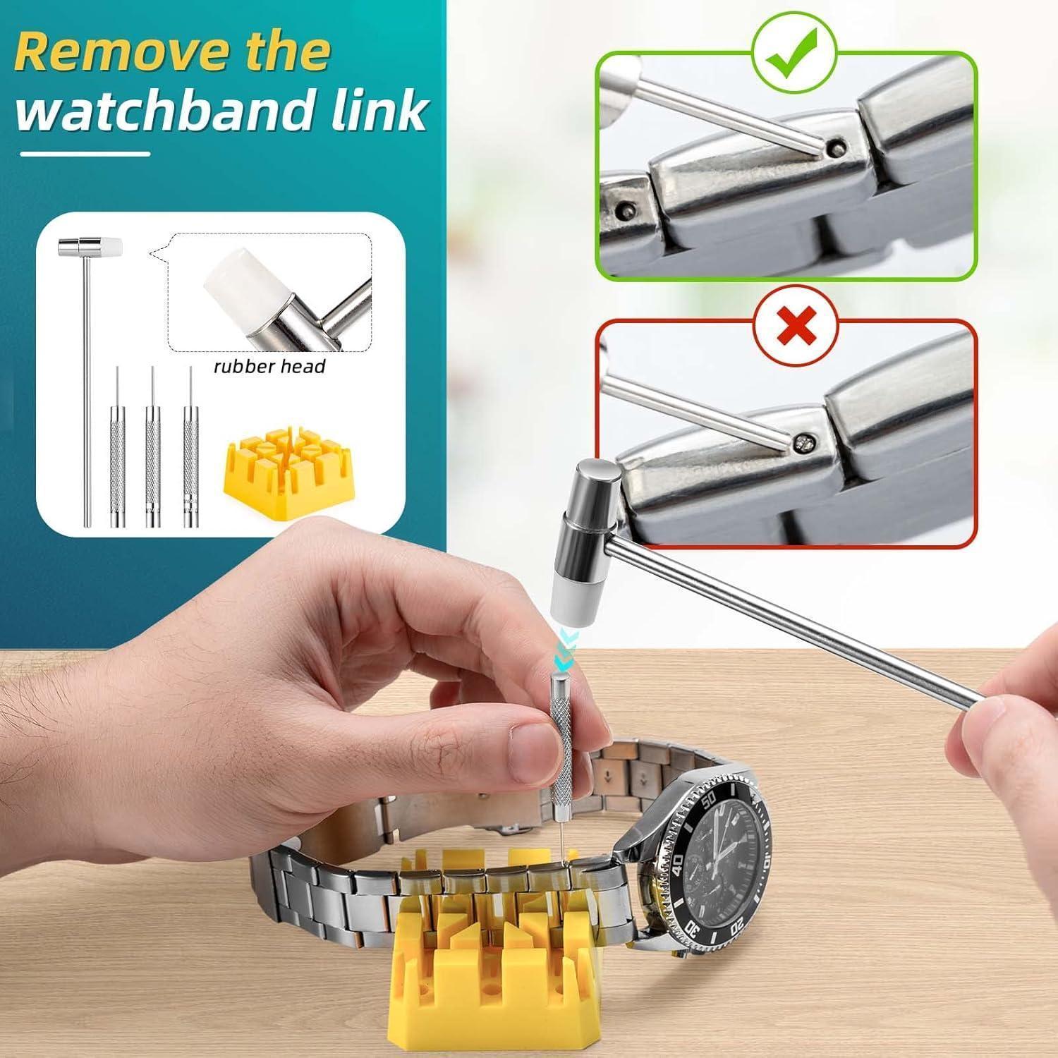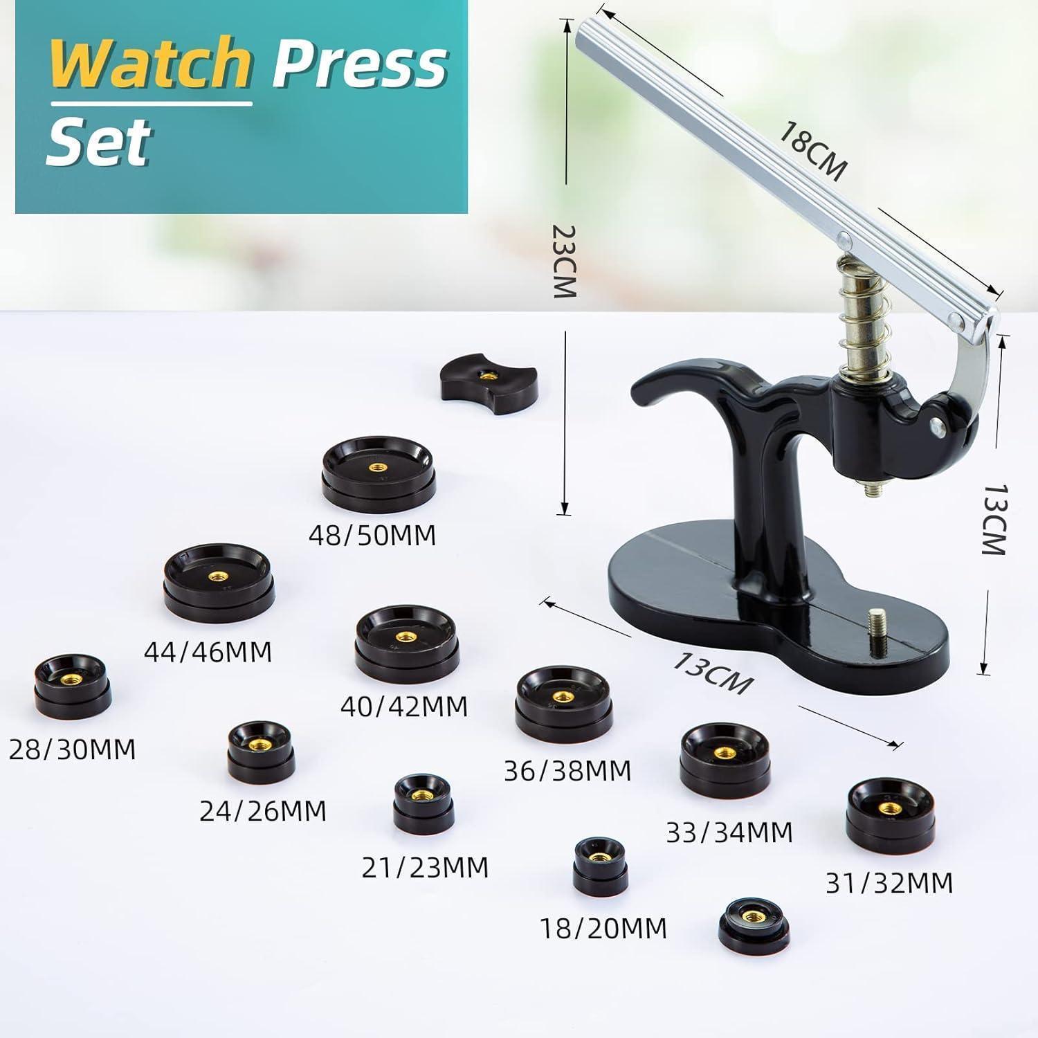 Kompletter Werkzeugsatz: Uhrenöffner,2*Federstegwerkzeug, Uhrengliedentferner mit 6*Ersatzstift, Uhrengehäuse & Bandhalter, Pinzette, kleiner Hammer, 3*Stiftstempel, Schwammblock, Reinigungstücher und 54*Federsteg. Die Uhrendeckelpresse kommt mit 12 Matrizen und hat einen Größenbereich von 18mm-50mm und mit zwei speziellen Matrizen. Außerdem haben wir auch detaillierte Bedienungsanleitung für alle Werkzeuge, die jeder leicht verstehen kann.