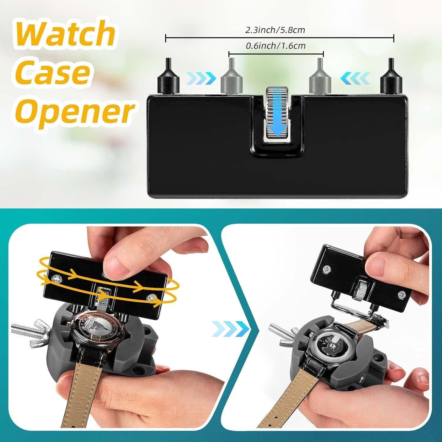 2023 Neueste uhrenwerkzeug kombination: Ein professionelles uhrmacherwerkzeug set und uhrendeckelpresse in einem, die alle arten von uhrenproblemen lösen können und für alle arten von uhren gelten. Verwenden Sie uhren batteriewechsel set, um das Gehäuse zu öffnen und die Batterien oder Teile auszutauschen. Nachdem Sie das Problem gelöst haben, setzen Sie den Gehäuseboden mit der Uhrenpresse wieder ein. Das Reparieren einer Uhr ist nur einen Augenblick entfern!