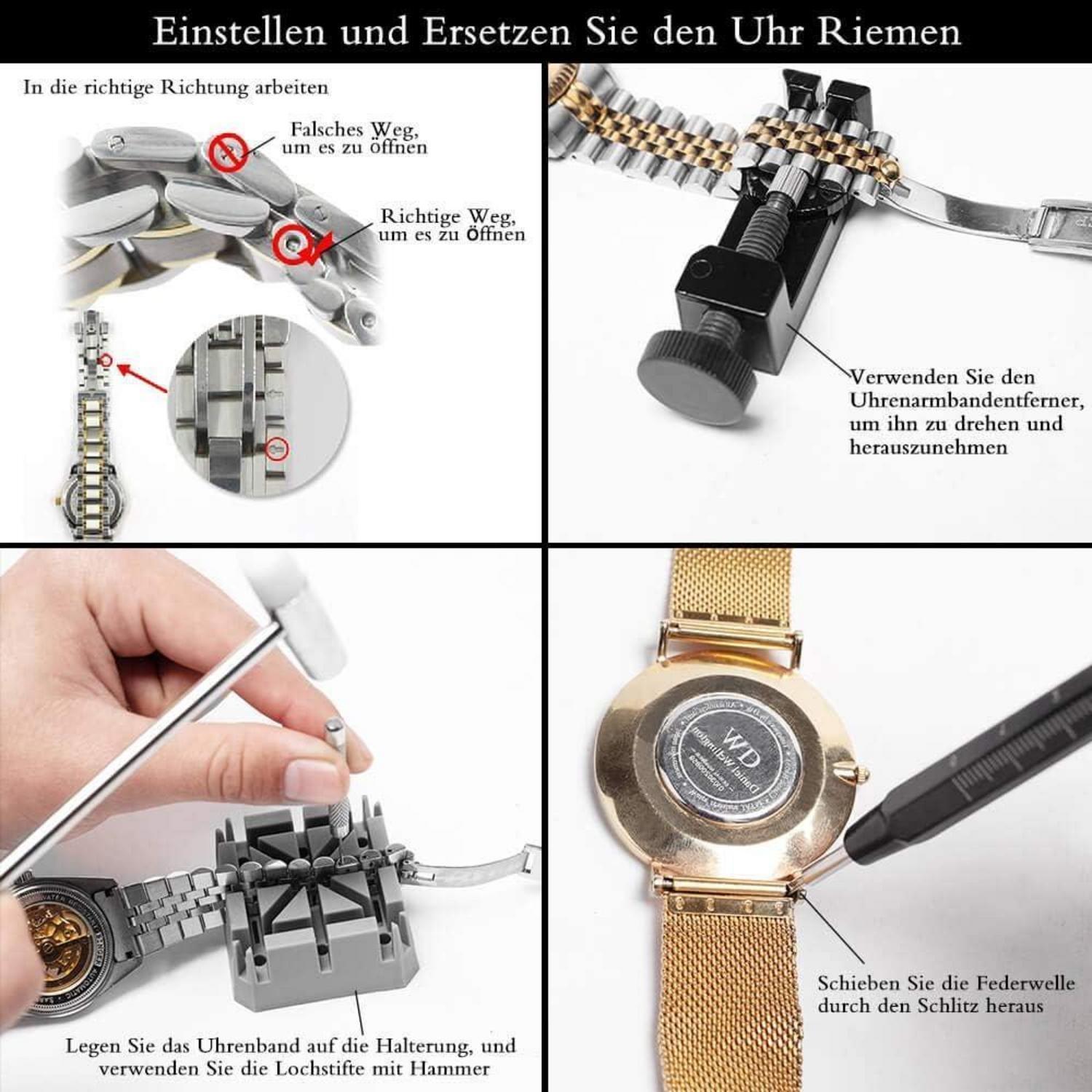 Dieses Uhrmacherwerkzeug Set beinhaltet weitere Lochnadeln, Zubehör für Uhrentferner und Federstangenteile zum Entfernen und Ersetzen von Uhrenarmbändern. Egal ob das Anpassen oder Austauschen des Uhrenarmbands, das Ersetzen der Batterie oder das Entfernen des Uhrengehäuses - mit diesem Set können Sie all dies bequem von zu Hause aus erledigen.