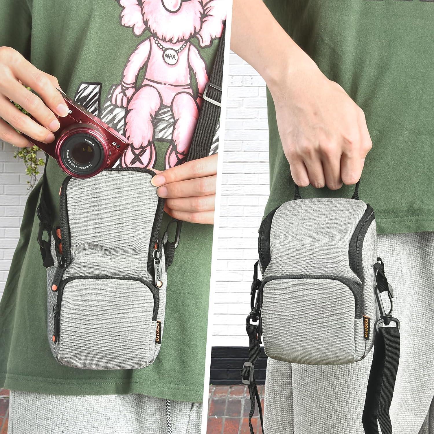 Die kleine Kameratasche ist speziell für Kameras ohne Spiegel konzipiert und besteht aus wasserdichtem Material, das vor Regen schützt (nicht jedoch für Unterwasserzwecke geeignet). Mit einer Innengröße von 13 x 11 x 8 cm und einer Außengröße von 15 x 12 x 10,5 cm bietet die Tasche ausreichend Platz für verschiedene Kameramodelle, einschließlich Sony W800, RX100, A600, A5100, Canon PowerShot SX620, SX730, G7X, Nikon A1000, W100, Fujifilm Instax Mini 11, SQ20 und mehr.