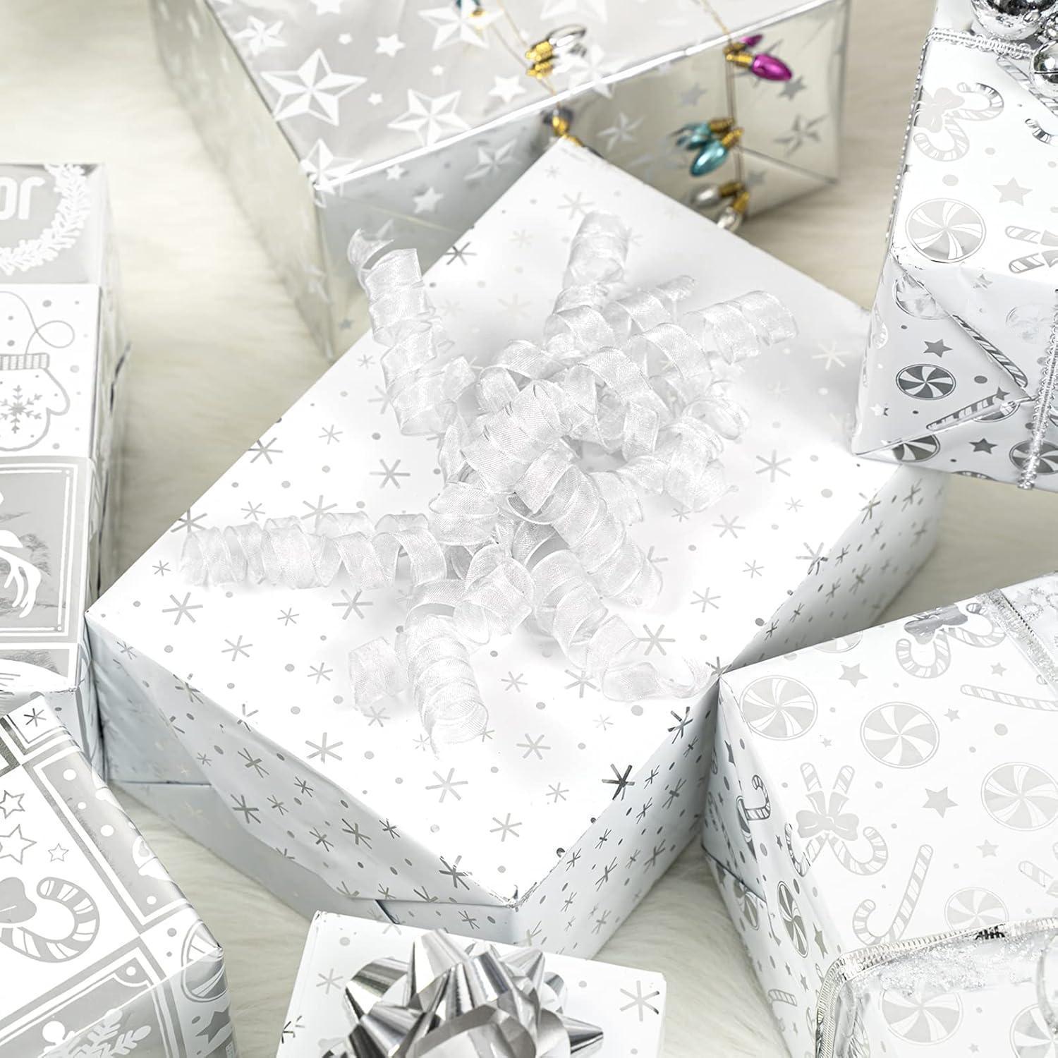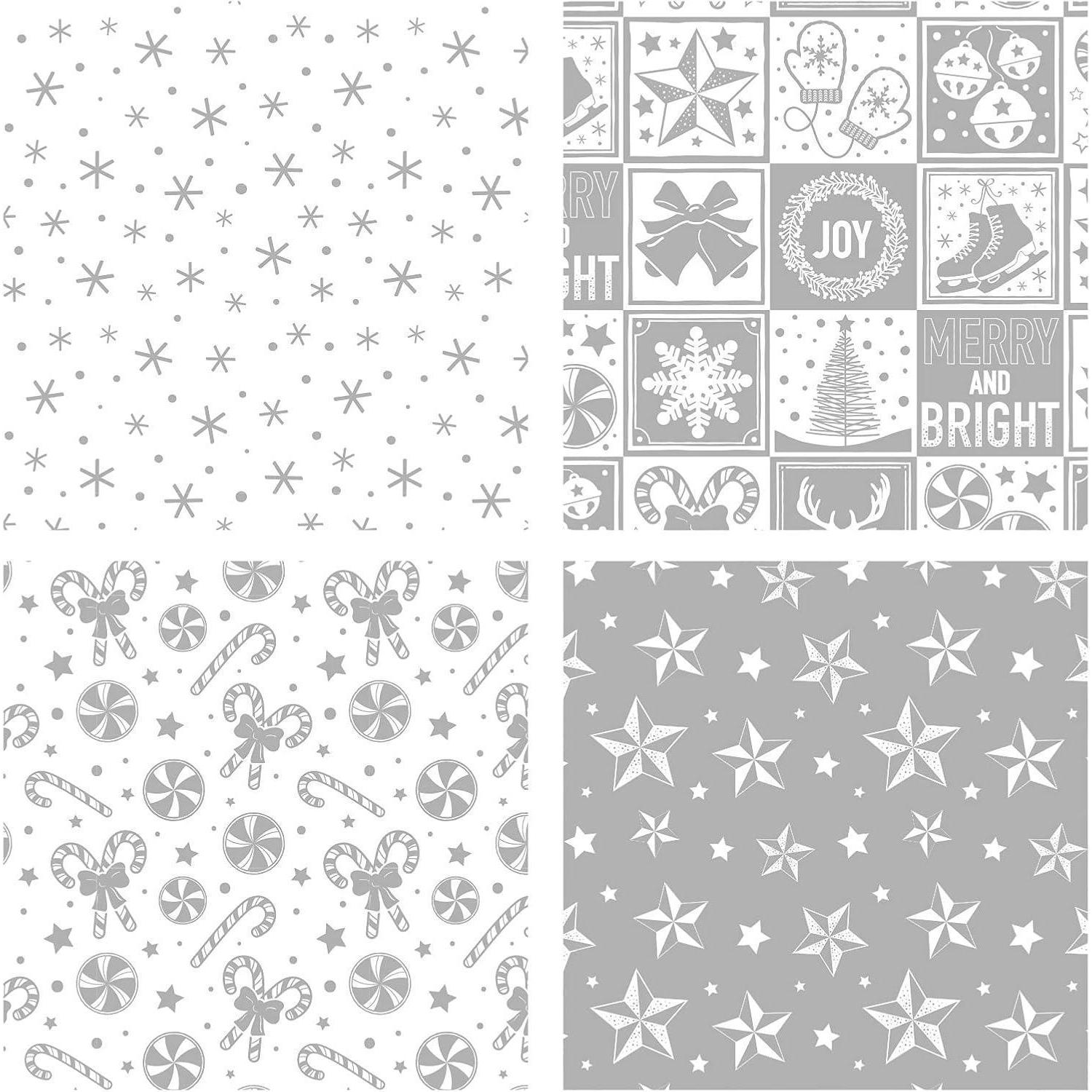 Die Designvielfalt mit silbernen Zuckerstangen, Windrädern, Weihnachtsmotiven und Schneeflocken bietet eine Auswahl an festlichen Motiven, die zu jedem Geschenk oder Dekorationsstil passen. Die Rasterlinien auf der Rückseite jedes Papiers erleichtern das Zuschneiden und sorgen für saubere Kanten.