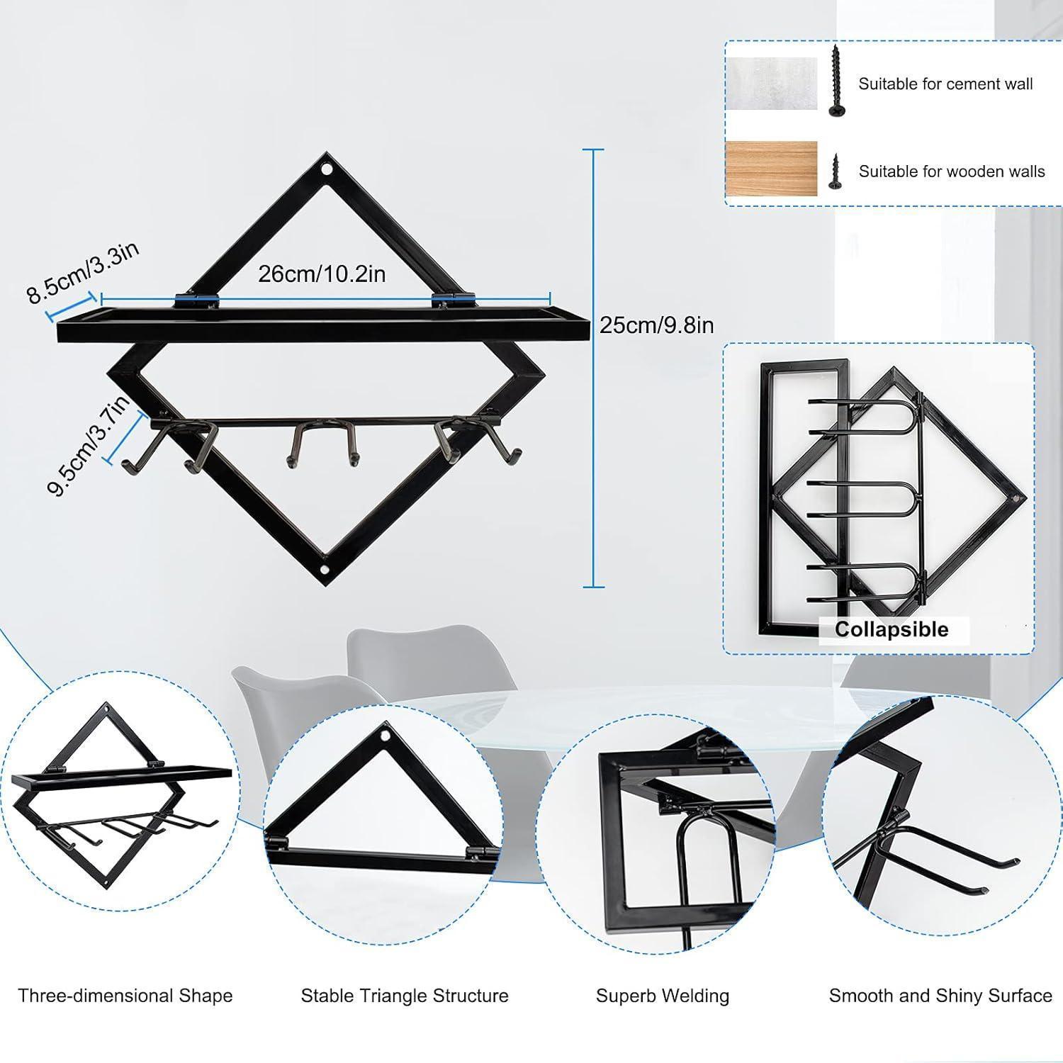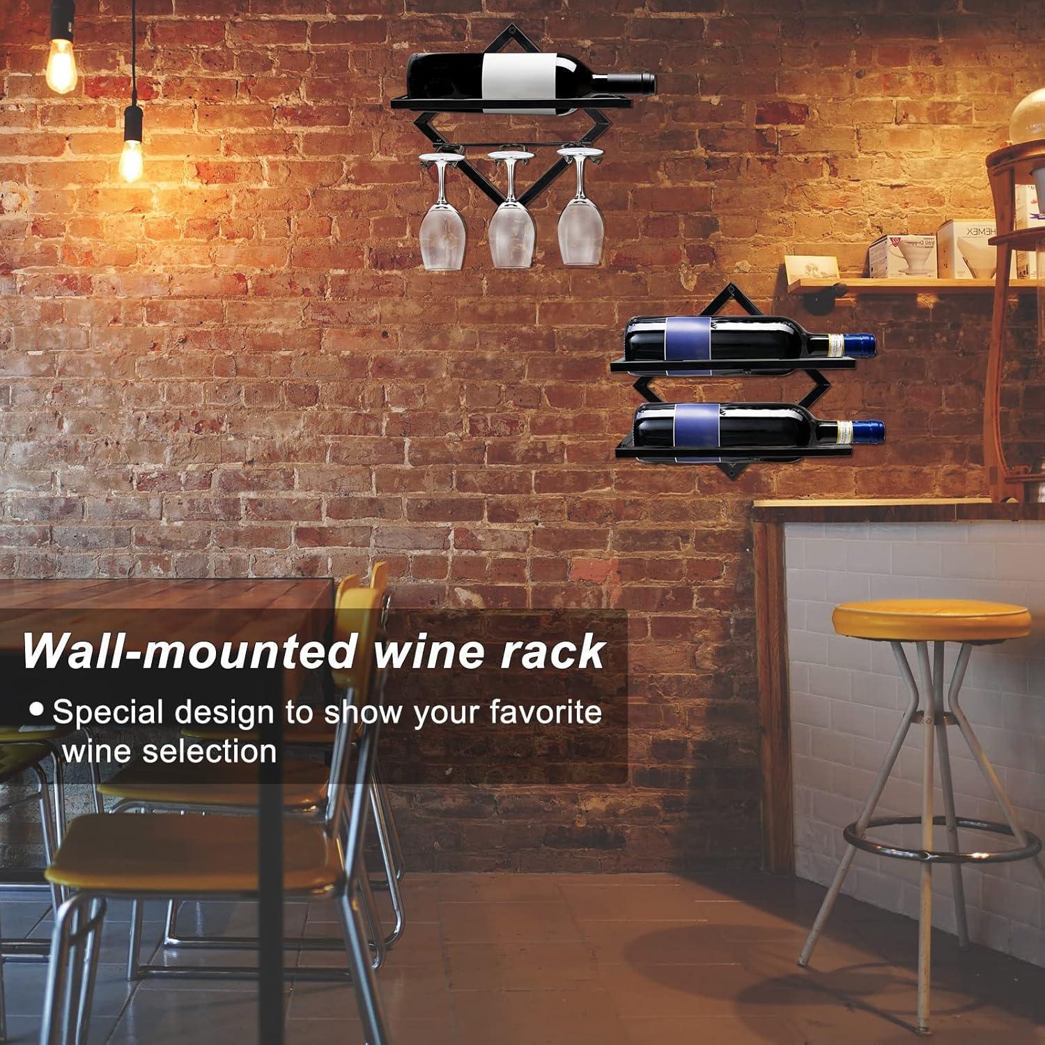 Weinflaschenhalter mit Weinglashalter: 2pcs Metall Wandmontierter Weinhalter Stemware Glass Rack, Zusammenklappbarer Wandbehang Rotweinregal Organizer mit 3 Stielglashaltern, Schwarz Weinflaschenaufhänger für Home Kitchen Bar Wanddekor.
