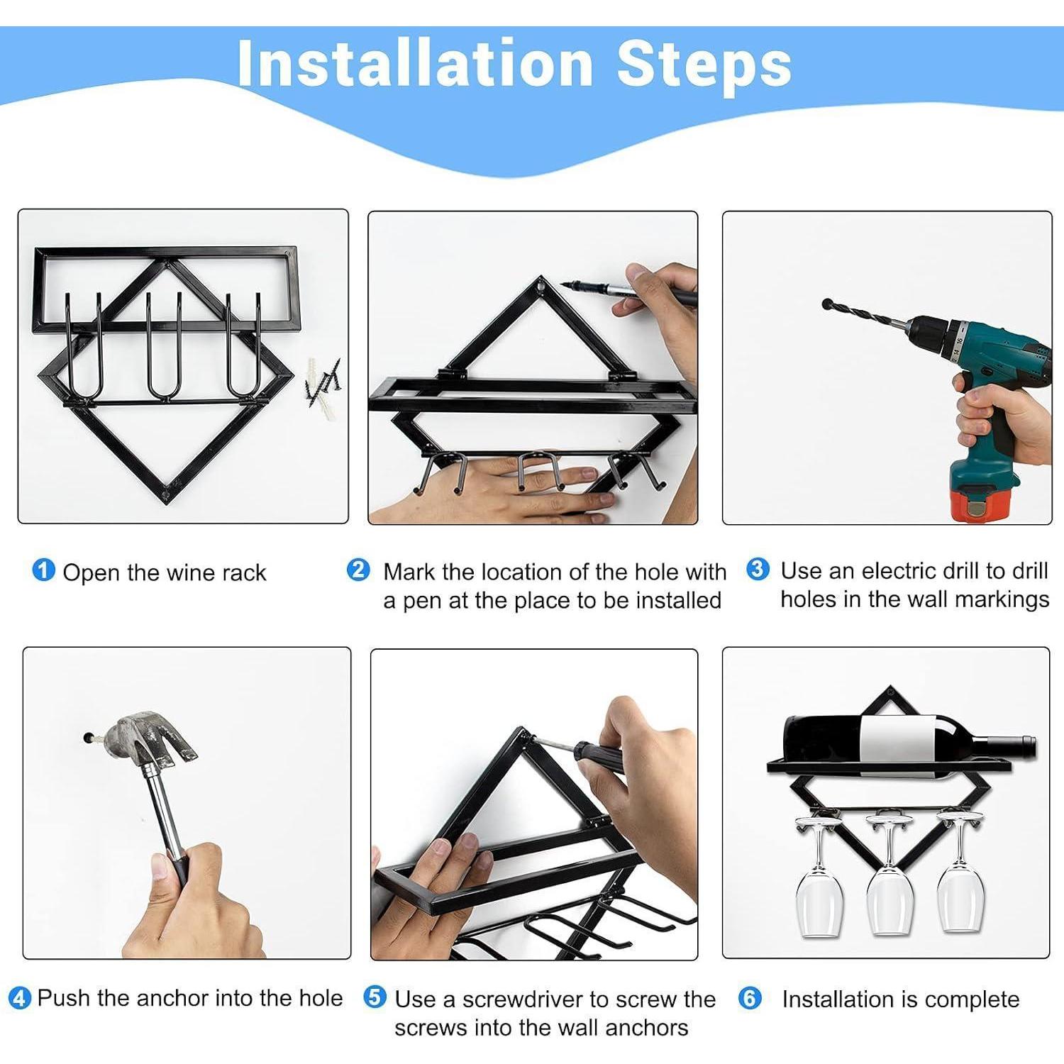 Einfach zu installieren: Jedes Set beinhaltet 1 Weinregal, 4 Nägel, 2 Erweiterungsnägel, sowie Befestigungsmaterial. Befestigen Sie es einfach mit Hilfe von Werkzeugen.