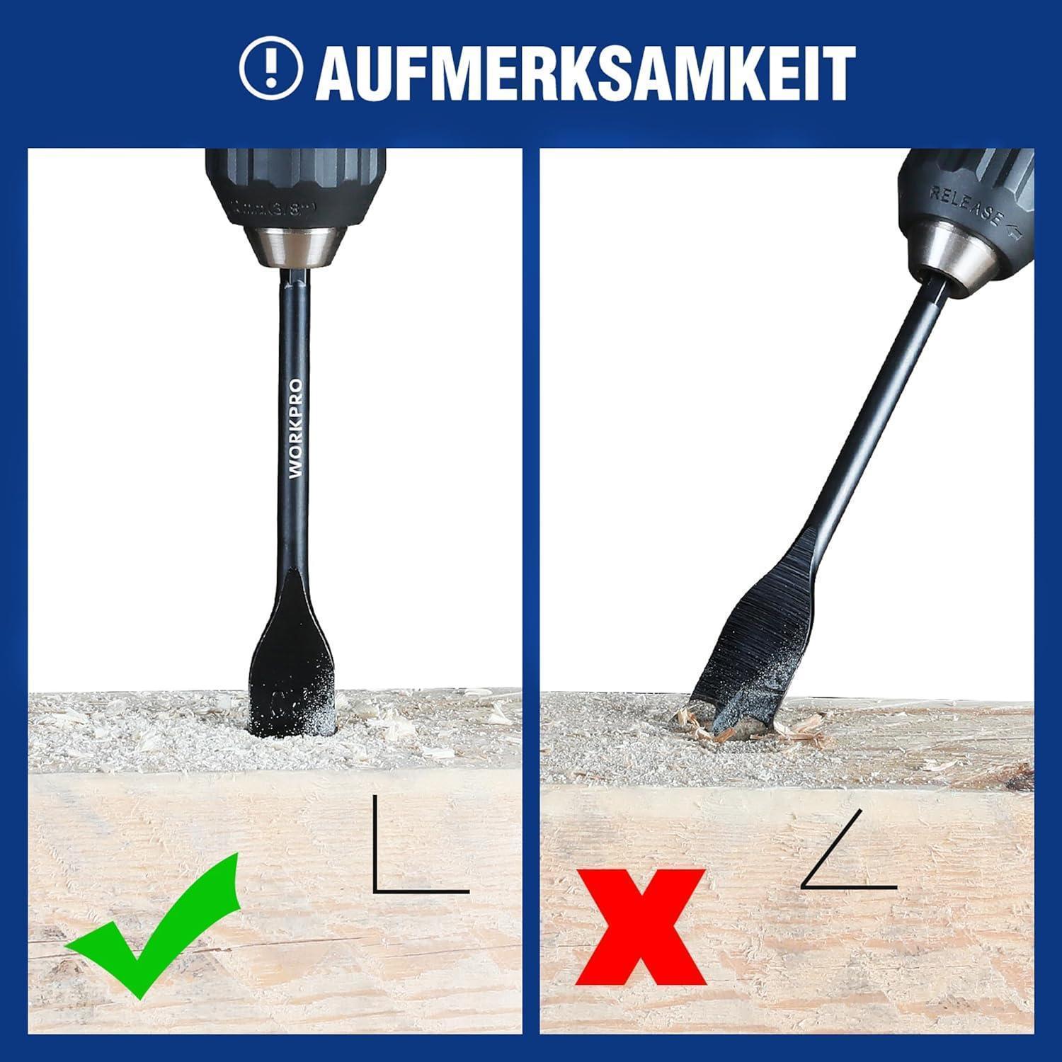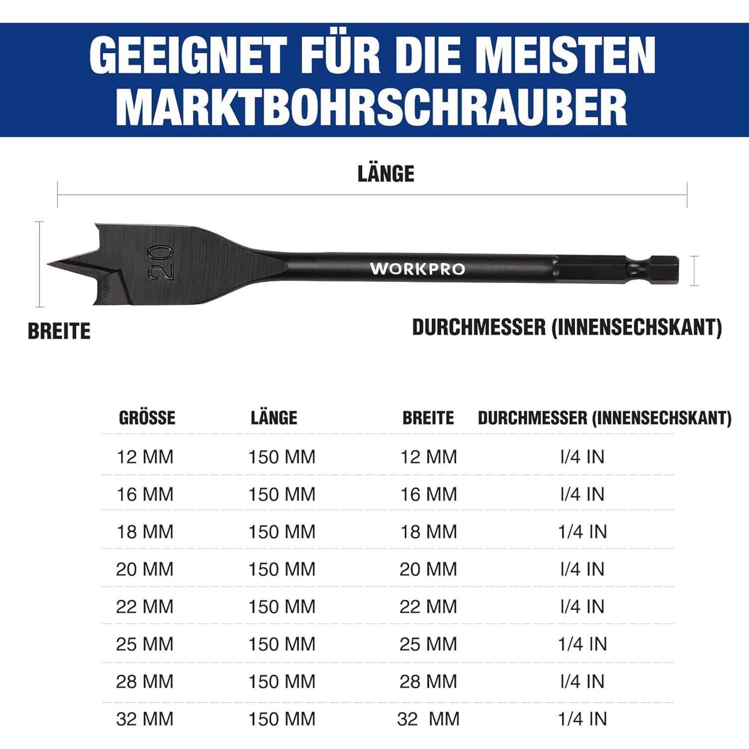 WORKPRO 8tlg. Flachfräsbohrer Set 12/16/18/20/22/25/28/32mm Holzbohrer 150mm