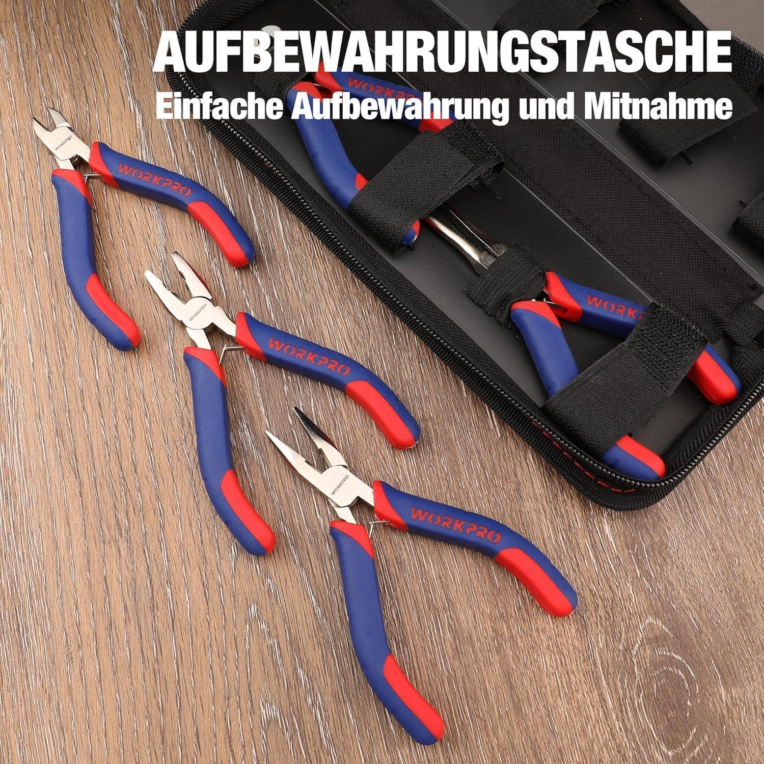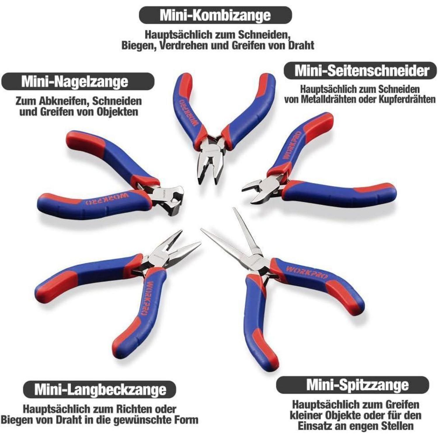 Vielseitig einsetzbar - Das WORKPRO Mini-Zangen-Set bietet 5 verschiedene Zangen: Seitenschneider, Combizange, Vornschnieder, Flachrundzange und Spitzzange. Diese Vielseitigkeit ermöglicht es, Präzisionsarbeiten in einer Vielzahl von Projekten und Handwerken durchzuführen.