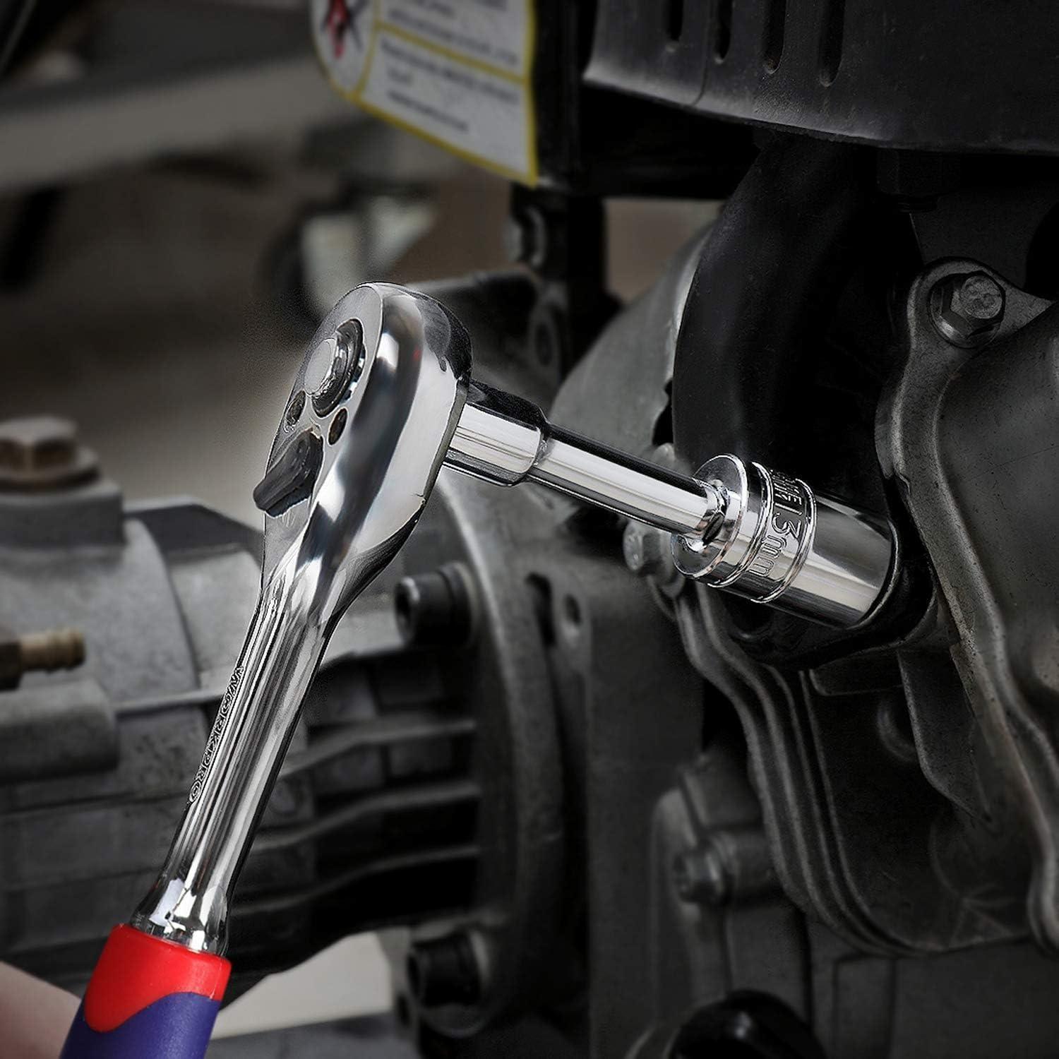 Der ergonomisch gestaltete und angenehm weiche Handgriff sorgt für ein komfortables Arbeiten, auch über längere Zeiträume. Die praktische Halterung ermöglicht eine ordentliche Aufbewahrung der Steckschlüssel und minimiert das Risiko des Verlierens.