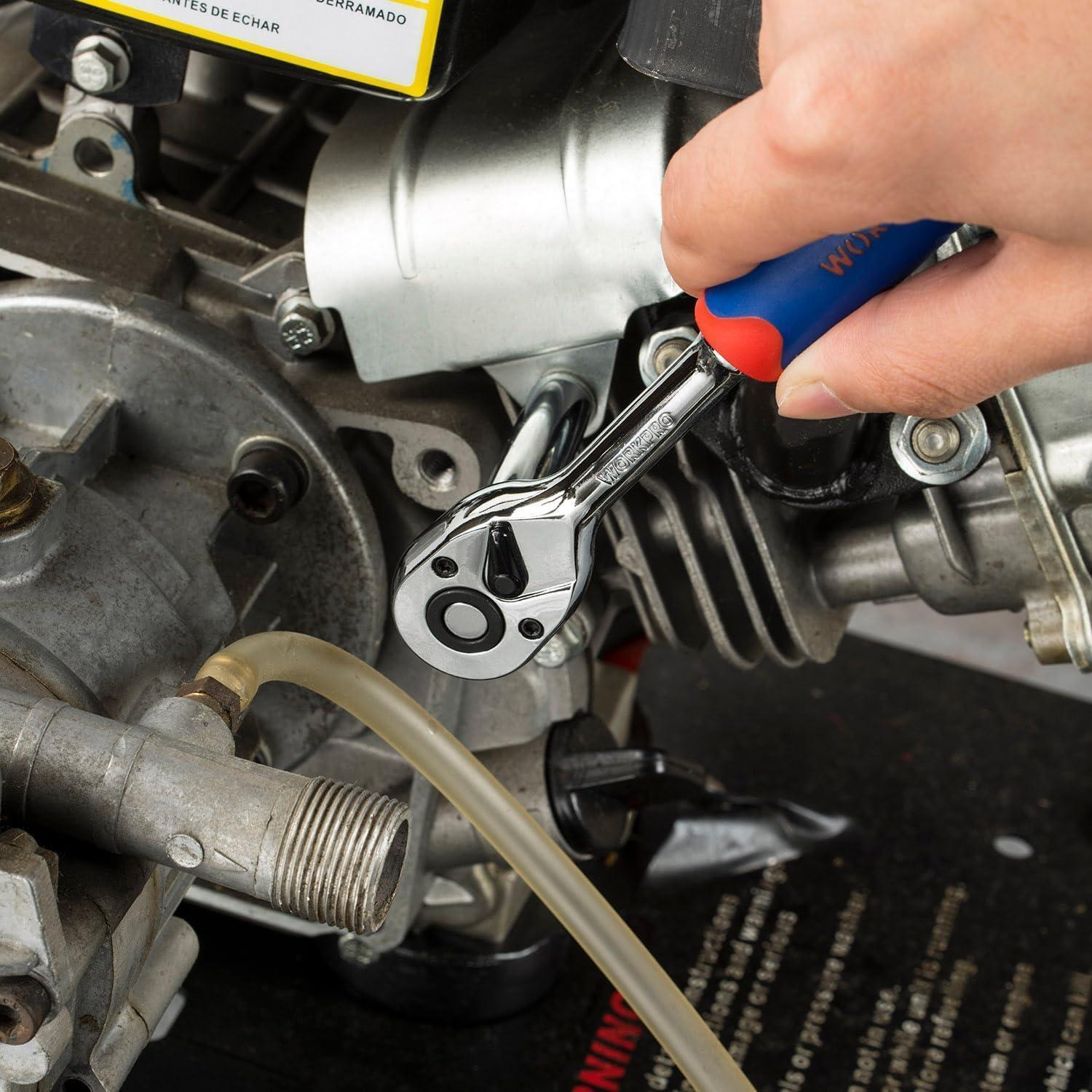 Die Umschaltknarre mit ihren 72 Zähnen ermöglicht ein präzises Arbeiten und spart Zeit und Energie. Mit dem Druckknopf am Ratschengriff können die Steckschlüsseleinsätze schnell und einfach gewechselt werden. So wird das Schrauben zum Kinderspiel.