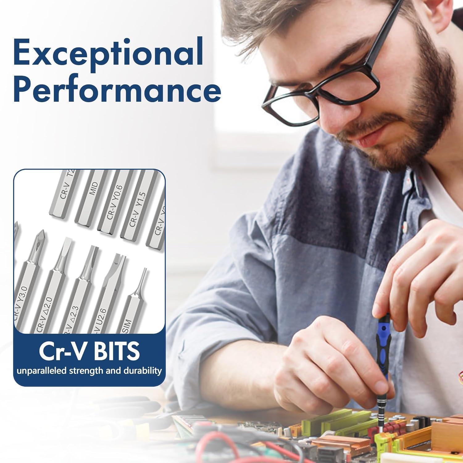 Dank des humanisierten Designs mit einem ergonomischen Griff liegt das Werkzeug bequem in der Hand, auch bei längeren Arbeiten. Das Set eignet sich perfekt für Reparaturen an iPhone, iPad, MacBook, Handy, PC, Computer, Laptop, Tablet, Kamera, Spielkonsolen, PS4/Xbox-Controller, Uhren, Brillen und anderen elektronischen Geräten. Sowohl Profis als auch Amateure werden die Vielseitigkeit und Qualität dieses Sets schätzen.
