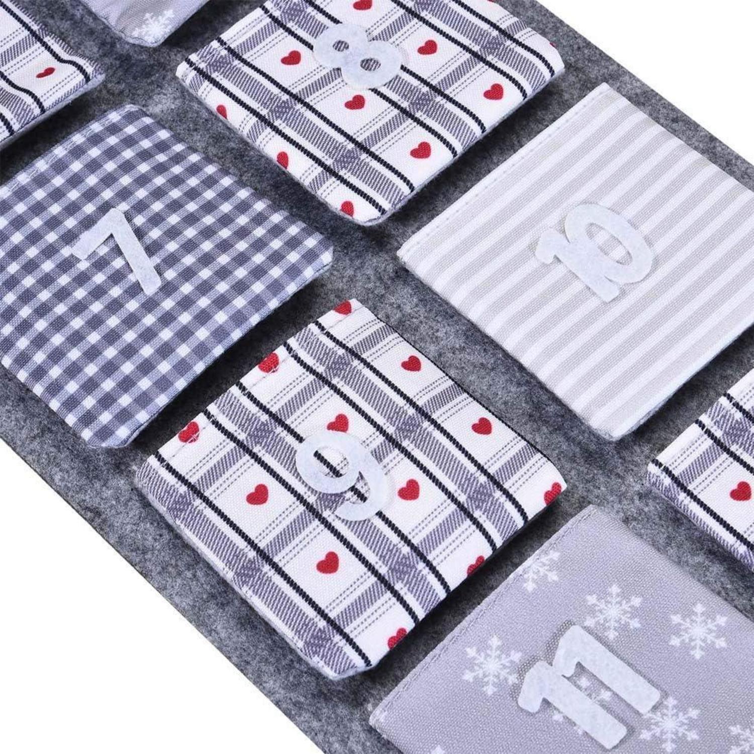 Der Adventskalender lässt sich einfach mit einer grauen Schnur als Aufhänger befestigen, sei es an der Wand oder an der Tür. Die 24 Adventssäckchen in verschiedenen Designs wie beige Schneeflocke, rote Herzen und grüne Quadrate bieten eine warme und festliche Atmosphäre für die Weihnachtszeit.