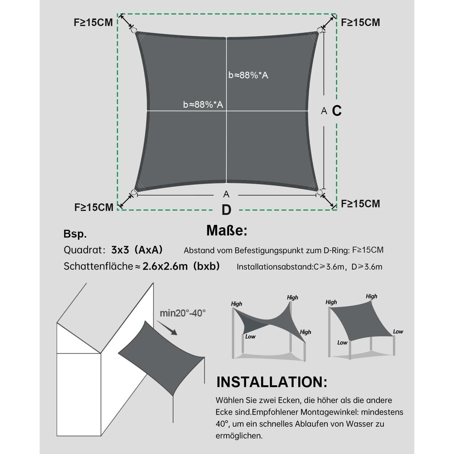 XXL Sonnensegel Wasserdicht 4x4m mit UV Schutz Sonnenschutz