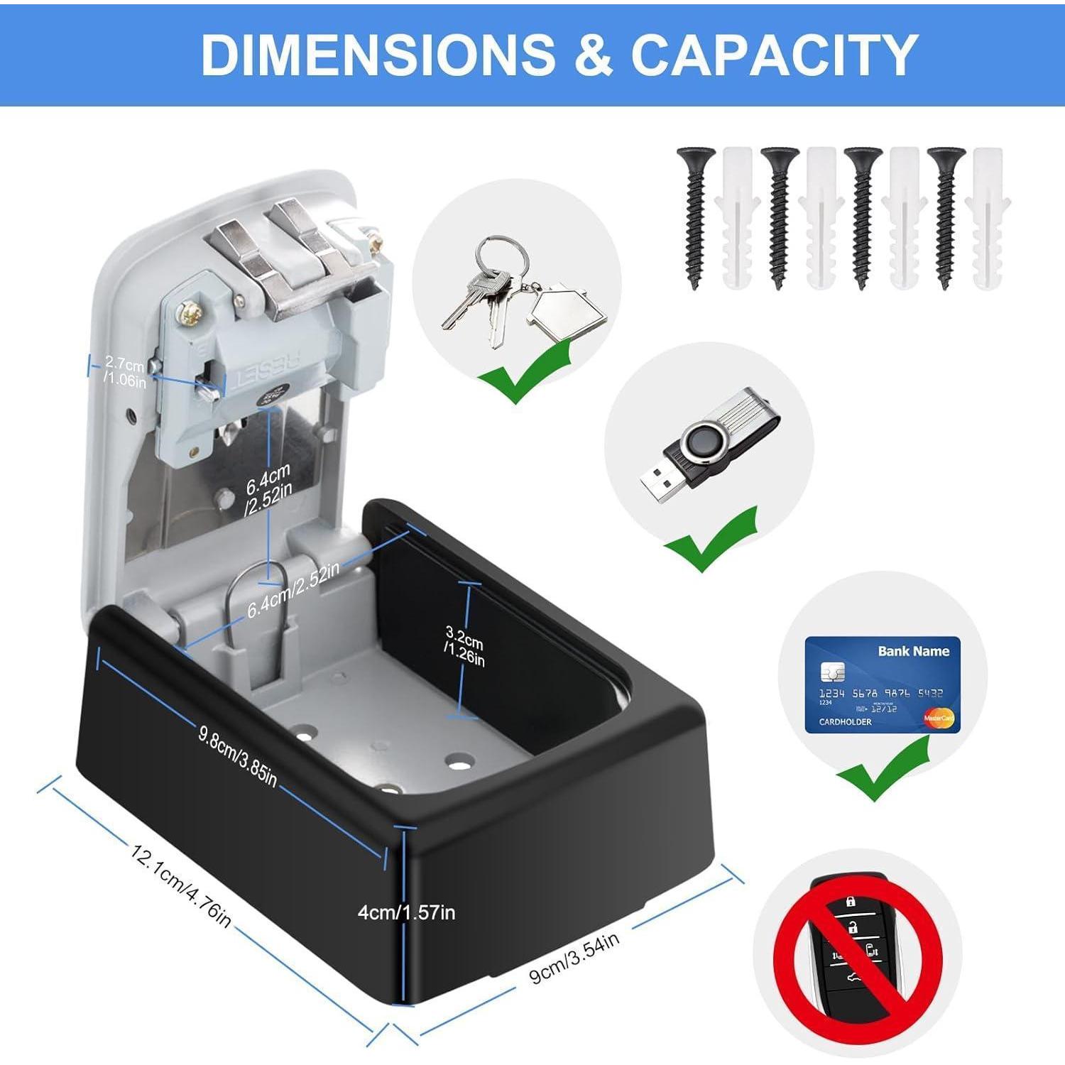 Mit einer Kapazität von bis zu 5 Schlüsseln und zusätzlichem Platz für Kreditkarten und USB-Sticks bietet dieser Schlüsselsafe ausreichend Stauraum für Ihre wichtigen Accessoires. Bitte beachten Sie, dass dickere Gegenstände wie Funk-Autoschlüssel nicht durch das Schloss passen.