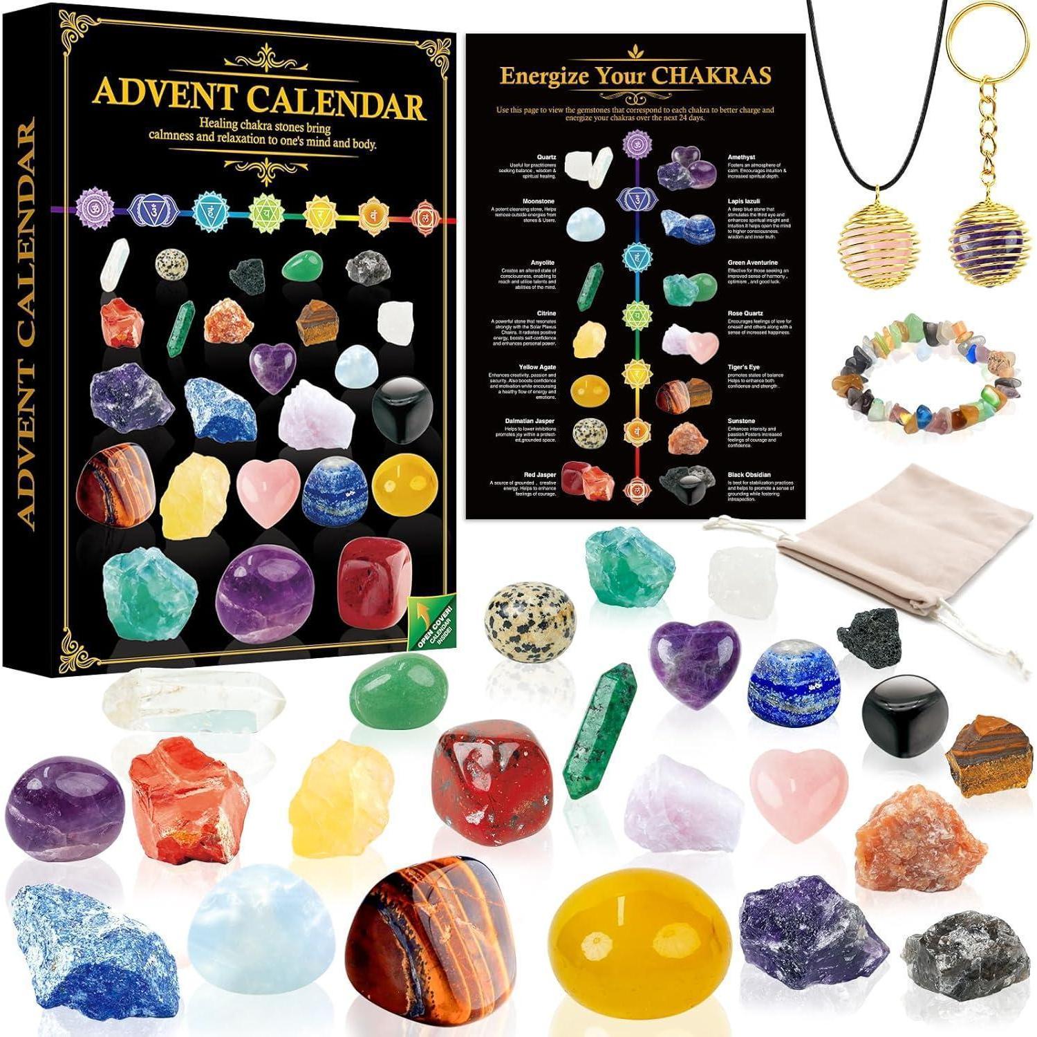 KRISTALLE ADVENTSKALENDER GESCHENKSET ENTHÄLT: Dieser Weihnachts-Adventskalender enthält funkelnde Edelsteine wie Rosenquarz, Amethyst, Tigerauge, Obsidian, gelber Achat und grüner Aventurin; wird mit einer Halskette und einem Schlüsselanhänger geliefert; enthält einen Edelstein-Organisationsbeutel zur Aufbewahrung der Edelsteine; wird mit einem Anleitungsblatt geliefert, das die Eigenschaften der Edelsteine beschreibt; das perfekte Adventskalender-Kristallset für Anfänger und erfahrene Sammler.